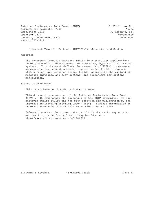 G., Nottingham, M., and J. Mogul, "Registration Procedures for Message Header Fields", BCP 90, RFC 3864, September 2004. [OWASP] van der Stock, A., Ed., "A Guide to Building Secure Web Applications and Web Services", The Open Web Application Security Project (OWASP) 2.0.1, July 2005, <https://www.owasp.org/>. [REST] Fielding, R., "Architectural Styles and the Design of Network-based Software Architectures", Doctoral Dissertation, University of California, Irvine, September 2000, <http://roy.gbiv.com/pubs/dissertation/top.htm>. [RFC1945] Berners-Lee, T., Fielding, R., and H. Nielsen, "Hypertext Transfer Protocol -- HTTP/1.0", RFC 1945, May 1996. [RFC2049] Freed, N. and N. Borenstein, "Multipurpose Internet Mail Extensions (MIME) Part Five: Conformance Criteria and Examples", RFC 2049, November 1996. [RFC2068] Fielding, R., Gettys, J., Mogul, J., Nielsen, H., and T. Berners-Lee, "Hypertext Transfer Protocol -- HTTP/1.1", RFC 2068, January 1997. [RFC2295] Holtman, K. and A. Mutz, "Transparent Content Negotiation in HTTP", RFC 2295, March 1998. [RFC2388] Masinter, L., "Returning Values from Forms: multipart/ form-data", RFC 2388, August 1998. [RFC2557] Palme, F., Hopmann, A., Shelness, N., and E. Stefferud, "MIME Encapsulation of Aggregate Documents, such as HTML (MHTML)", RFC 2557, March 1999. [RFC2616] Fielding, R., Gettys, J., Mogul, J., Frystyk, H., Masinter, L., Leach, P., and T. Berners-Lee, "Hypertext Transfer Protocol -- HTTP/1.1", RFC 2616, June 1999. [RFC2774] Frystyk, H., Leach, P., and S. Lawrence, "An HTTP Extension Framework", RFC 2774, February 2000. [RFC2817] Khare, R. and S. Lawrence, "Upgrading to TLS Within HTTP/1.1", RFC 2817, May 2000. [RFC2978] Freed, N. and J. Postel, "IANA Charset Registration Procedures", BCP 19, RFC 2978, October 2000. Fielding & Reschke Standards Track [Page 87]