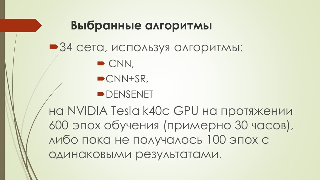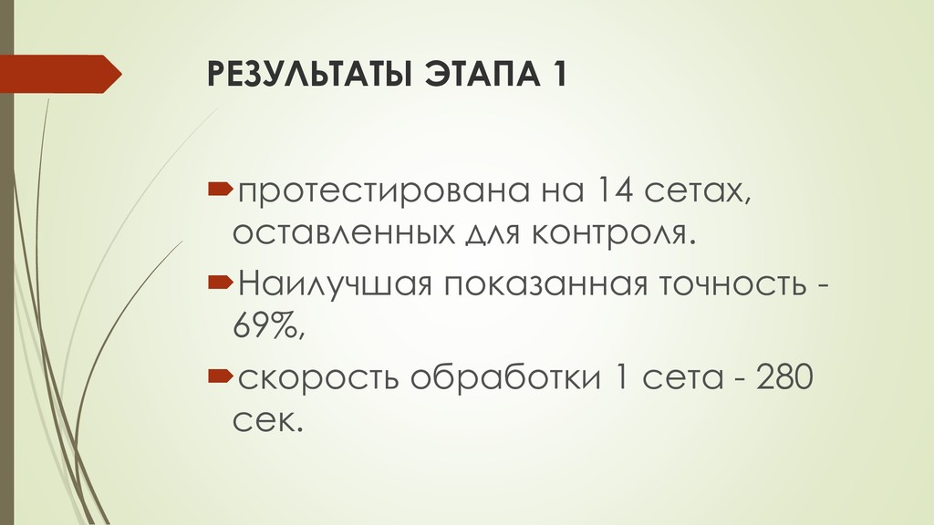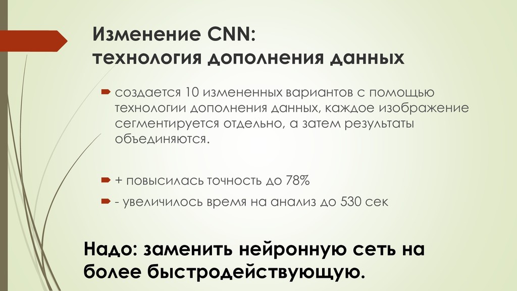 с помощью технологии дополнения данных, каждое изображение сегментируется отдельно, а затем результаты объединяются. + повысилась точность до 78% - увеличилось время на анализ до 530 сек Надо: заменить нейронную сеть на более быстродействующую.