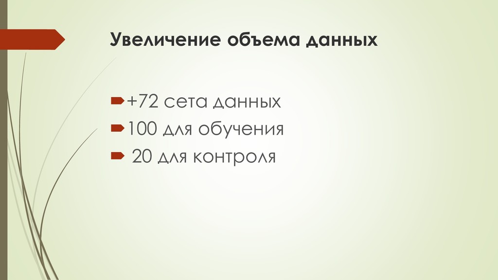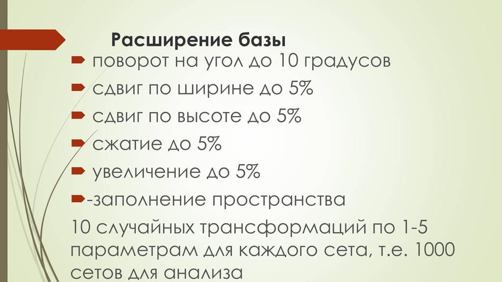 сдвиг по ширине до 5% сдвиг по высоте до 5% сжатие до 5% увеличение до 5% -заполнение пространства 10 случайных трансформаций по 1-5 параметрам для каждого сета, т.е. 1000 сетов для анализа