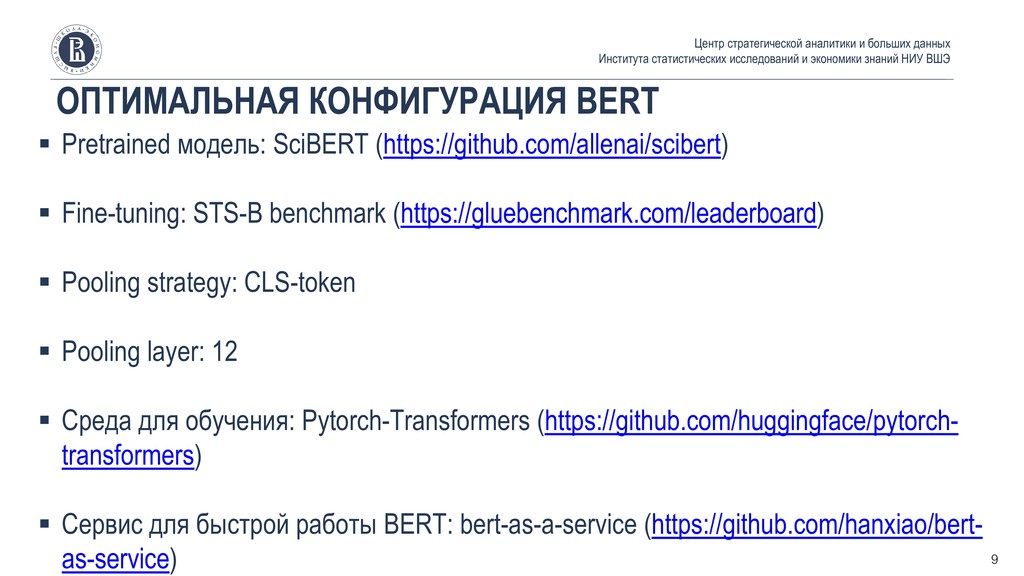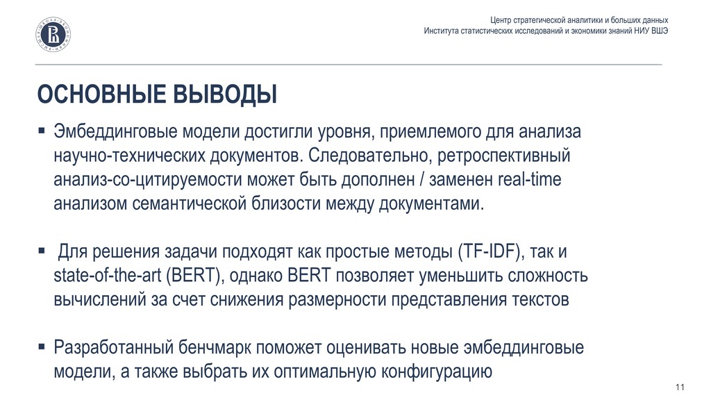 статистических исследований и экономики знаний НИУ ВШЭ ▪ Эмбеддинговые модели достигли уровня, приемлемого для анализа научно-технических документов. Следовательно, ретроспективный анализ-со-цитируемости может быть дополнен / заменен real-time анализом семантической близости между документами. ▪ Для решения задачи подходят как простые методы (TF-IDF), так и state-of-the-art (BERT), однако BERT позволяет уменьшить сложность вычислений за счет снижения размерности представления текстов ▪ Разработанный бенчмарк поможет оценивать новые эмбеддинговые модели, а также выбрать их оптимальную конфигурацию