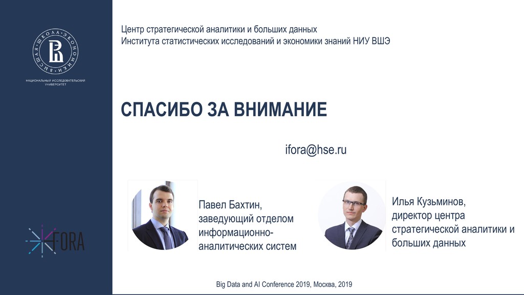 систем Центр стратегической аналитики и больших данных Института статистических исследований и экономики знаний НИУ ВШЭ Big Data and AI Conference 2019, Москва, 2019 Илья Кузьминов, директор центра стратегической аналитики и больших данных