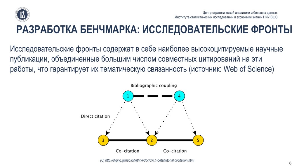 Института статистических исследований и экономики знаний НИУ ВШЭ 6 (С) http://diging.github.io/tethne/doc/0.6.1-beta/tutorial.cocitation.html Исследовательские фронты содержат в себе наиболее высокоцитируемые научные публикации, объединенные большим числом совместных цитирований на эти работы, что гарантирует их тематическую связанность (источник: Web of Science)