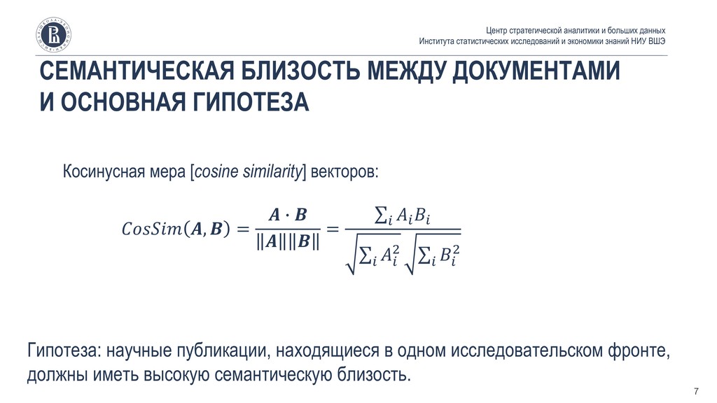 и больших данных Института статистических исследований и экономики знаний НИУ ВШЭ 7 Косинусная мера [cosine similarity] векторов: , = ∙ = σ σ 2 σ 2 Гипотеза: научные публикации, находящиеся в одном исследовательском фронте, должны иметь высокую семантическую близость.