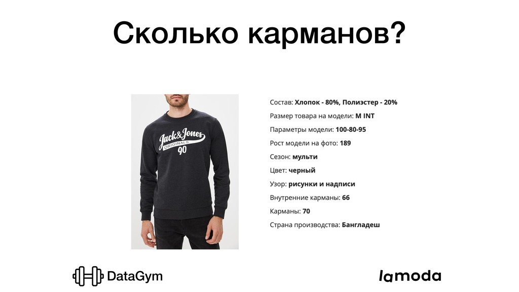 LAMODA — это один из основных игроков онлайн-торговли в России с более чем 5 миллионами товаров в каталоге. И это не только сайт. Это - свои склады размером с футбольные поля, свои курьеры и парк автомобилей, свой отдел e-production с фото-студией и моделями. Компания не только делает свои фотографии товаров, но и сама создает описание и заполняет атрибуты. К сожалению, ручной процесс не исключает ошибок.