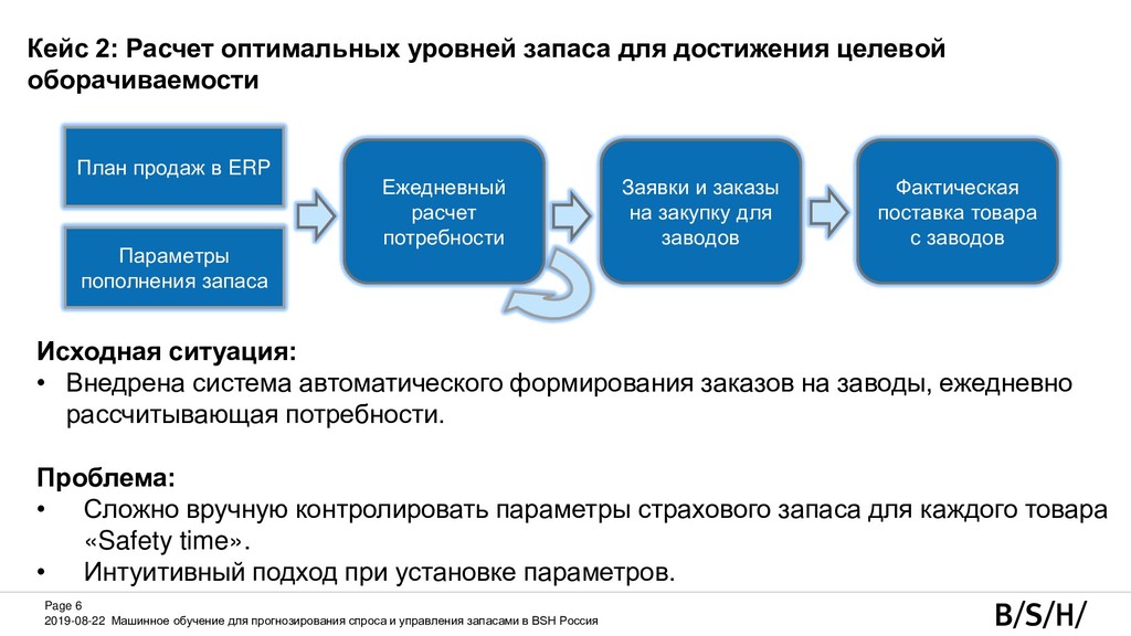 BSH Россия Page 5 Кейс 1. Прогнозирование продаж для долгосрочного планирования спроса Расчет сезонных коэффициентов по категориям товара Десезонирование данных продаж (очистка сезонных эффектов) Алгоритм «бустинга» (история продаж, sellout, цены, промо) Сезонирование результатов (Наложение сезонности) Система учета промо Статистика Sell- out Статистика товарооборота Использование результатов при планировании Алгоритм: