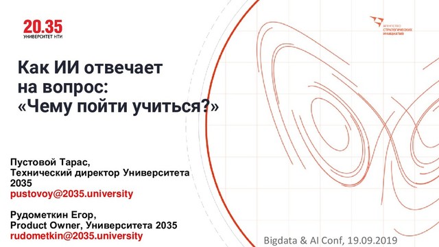 Технический директор Университета 2035 [email protected] Рудометкин Егор, Product Owner, Университета 2035 [email protected] Bigdata & AI Conf, 19.09.2019