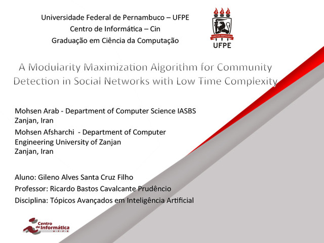 Apresentação do artigo "A Modularity Maximization Algorithm for Community Detection in Social Networks with Low Time Complexity " para o seminário da disciplina de Tópicos Avançados em Inteligência Artificial - CIn / UFPE.