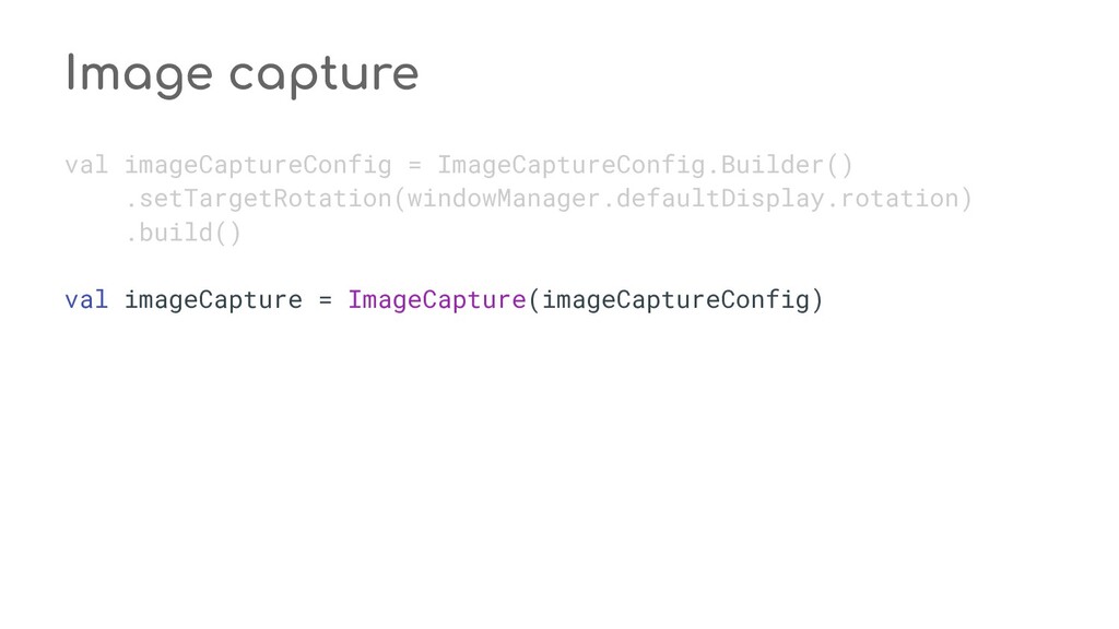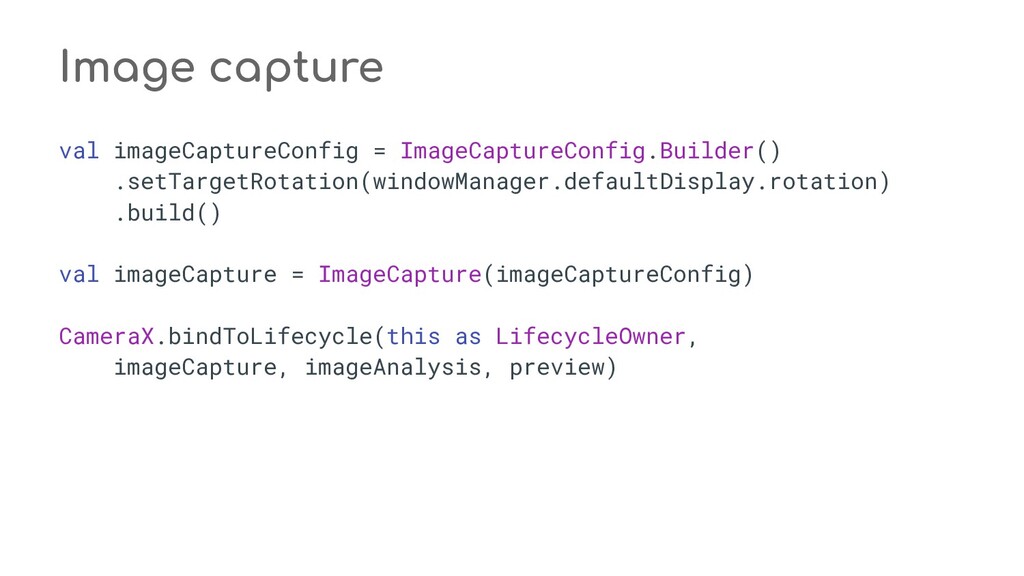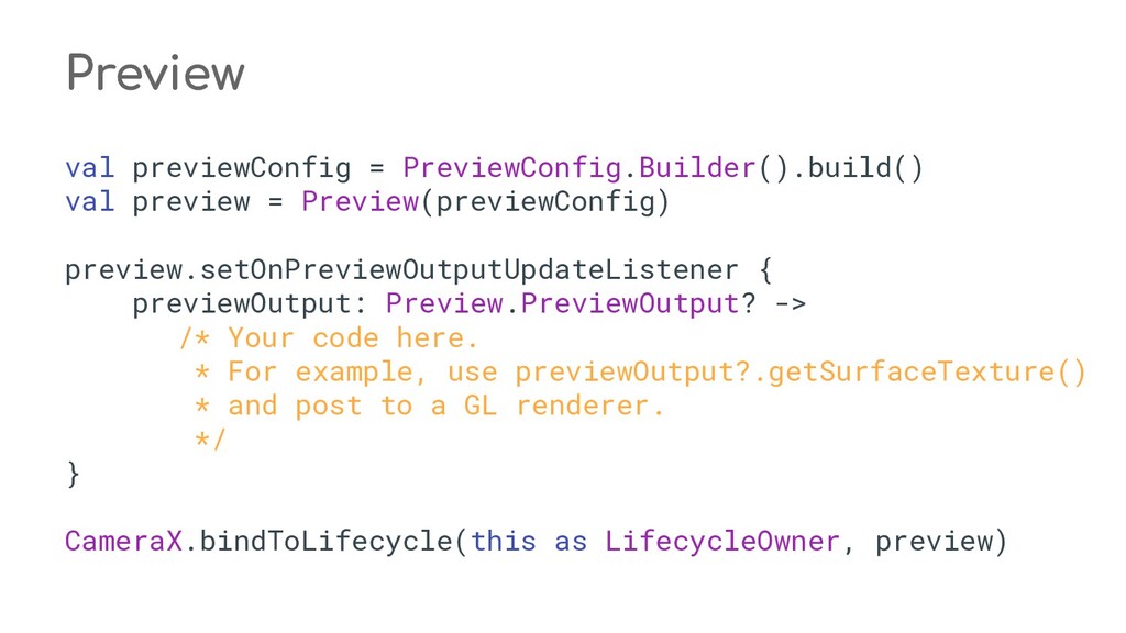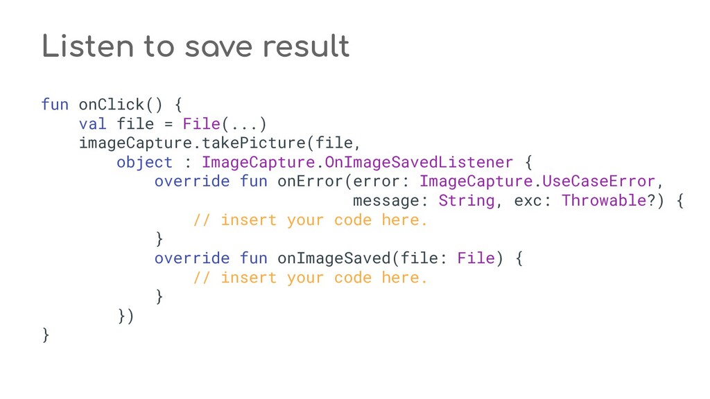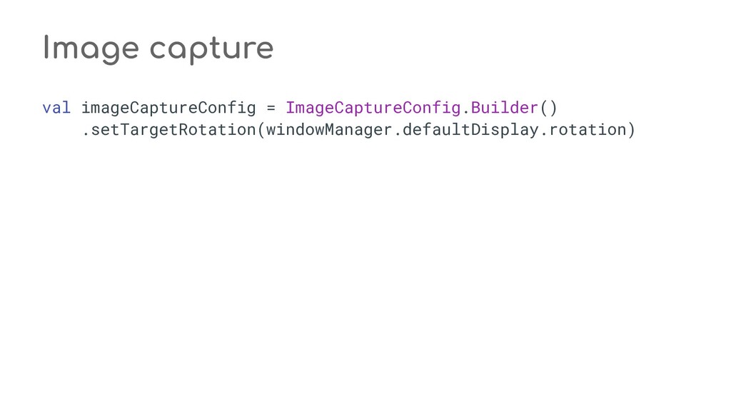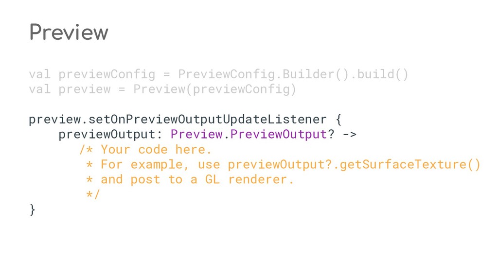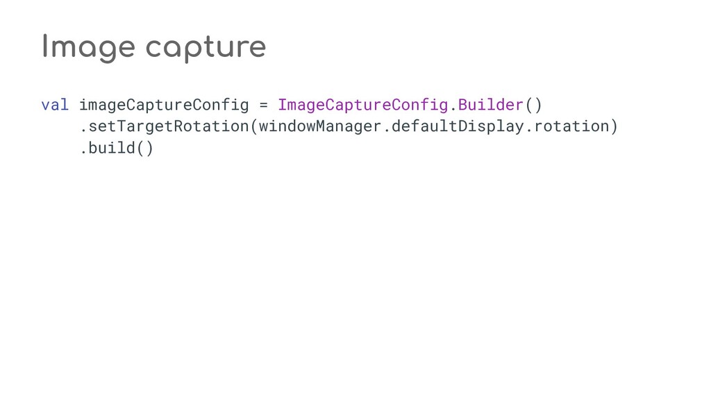 fun process(result: CaptureResult) { when (state) { STATE_PREVIEW -> Unit // Do nothing when the camera preview is working normally. STATE_WAITING_LOCK -> capturePicture(result) STATE_WAITING_PRECAPTURE -> { // CONTROL_AE_STATE can be null on some devices val aeState = result.get(CaptureResult.CONTROL_AE_STATE) if (aeState == null || aeState == CaptureResult.CONTROL_AE_STATE_PRECAPTURE || aeState == CaptureRequest.CONTROL_AE_STATE_FLASH_REQUIRED) { state = STATE_WAITING_NON_PRECAPTURE } } STATE_WAITING_NON_PRECAPTURE -> { // CONTROL_AE_STATE can be null on some devices val aeState = result.get(CaptureResult.CONTROL_AE_STATE) if (aeState == null || aeState != CaptureResult.CONTROL_AE_STATE_PRECAPTURE) { state = STATE_PICTURE_TAKEN captureStillPicture() } } } } private fun capturePicture(result: CaptureResult) { val afState = result.get(CaptureResult.CONTROL_AF_STATE) if (afState == null) { captureStillPicture() } else if (afState == CaptureResult.CONTROL_AF_STATE_FOCUSED_LOCKED || afState == CaptureResult.CONTROL_AF_STATE_NOT_FOCUSED_LOCKED) { // CONTROL_AE_STATE can be null on some devices val aeState = result.get(CaptureResult.CONTROL_AE_STATE) if (aeState == null || aeState == CaptureResult.CONTROL_AE_STATE_CONVERGED) { state = STATE_PICTURE_TAKEN captureStillPicture() } else { runPrecaptureSequence() } } } override fun onCaptureProgressed(session: CameraCaptureSession, request: CaptureRequest, partialResult: CaptureResult) { process(partialResult) } override fun onCaptureCompleted(session: CameraCaptureSession, request: CaptureRequest, result: TotalCaptureResult) { process(result) } } override fun onCreateView(inflater: LayoutInflater, container: ViewGroup?, savedInstanceState: Bundle? ): View? = inflater.inflate(R.layout.fragment_camera2_basic, container, false) override fun onViewCreated(view: View, savedInstanceState: Bundle?) { view.findViewById<View>(R.id.picture).setOnClickListener(this) view.findViewById<View>(R.id.info).setOnClickListener(this) textureView = view.findViewById(R.id.texture) } override fun onActivityCreated(savedInstanceState: Bundle?) { super.onActivityCreated(savedInstanceState) file = File(activity.getExternalFilesDir(null), PIC_FILE_NAME) } nsor coordinate * @param maxWidth The maximum width that can be chosen * @param maxHeight The maximum height that can be chosen * @param aspectRatio The aspect ratio * @return The optimal `Size`, or an arbitrary one if none were big enough */ @JvmStatic private fun chooseOptimalSize( choices: Array<Size>, textureViewWidth: Int, textureViewHeight: Int, maxWidth: Int, maxHeight: Int, aspectRatio: Size ): Size { // Collect the supported resolutions that are at least as big as the preview Surface val bigEnough = ArrayList<Size>() // Collect the supported resolutions that are smaller than the preview Surface val notBigEnough = ArrayList<Size>() val w = aspectRatio.width val h = aspectRatio.height for (option in choices) { if (option.width <= maxWidth && option.height <= maxHeight && option.height == option.width * h / w) { if (option.width >= textureViewWidth && option.height >= textureViewHeight) { bigEnough.add(option) } else { notBigEnough.add(option) } } } // Pick the smallest of those big enough. If there is no one big enough, pick the // largest of those not big enough. if (bigEnough.size > 0) { return Collections.min(bigEnough, CompareSizesByArea()) } else if (notBigEnough.size > 0) { return Collections.max(notBigEnough, CompareSizesByArea()) } else { Log.e(TAG, "Couldn't find any suitable preview size") return choices[0] } } @JvmStatic fun newInstance(): Camera2BasicFragment = Camera2BasicFragment() } } override fun onResume() { super.onResume() startBackgroundThread() // When the screen is turned off and turned back on, the SurfaceTexture is already // available, and "onSurfaceTextureAvailable" will not be called. In that case, we can open // a camera and start preview from here (otherwise, we wait until the surface is ready in // the SurfaceTextureListener). if (textureView.isAvailable) { openCamera(textureView.width, textureView.height) } else { textureView.surfaceTextureListener = surfaceTextureListener } } override fun onPause() { closeCamera() stopBackgroundThread() super.onPause() } private fun requestCameraPermission() { if (shouldShowRequestPermissionRationale(Manifest.permission.CAMERA)) { ConfirmationDialog().show(childFragmentManager, FRAGMENT_DIALOG) } else { requestPermissions(arrayOf(Manifest.permission.CAMERA), REQUEST_CAMERA_PERMISSION) } } override fun onRequestPermissionsResult(requestCode: Int, permissions: Array<String>, grantResults: IntArray) { if (requestCode == REQUEST_CAMERA_PERMISSION) { if (grantResults.size != 1 || grantResults[0] != PackageManager.PERMISSION_GRANTED) { ErrorDialog.newInstance(getString(R.string.request_permission)) .show(childFragmentManager, FRAGMENT_DIALOG) } } else { super.onRequestPermissionsResult(requestCode, permissions, grantResults) } } /** * Sets up member variables related to camera. * * @param width The width of available size for camera preview * @param height The height of available size for camera preview */ private fun setUpCameraOutputs(width: Int, height: Int) { val manager = activity.getSystemService(Context.CAMERA_SERVICE) as CameraManager try { for (cameraId in manager.cameraIdList) { val characteristics = manager.getCameraCharacteristics(cameraId) // We don't use a front facing camera in this sample. val cameraDirection = characteristics.get(CameraCharacteristics.LENS_FACING) if (cameraDirection != null && cameraDirection == CameraCharacteristics.LENS_FACING_FRONT) { continue } val map = characteristics.get( CameraCharacteristics.SCALER_STREAM_CONFIGURATION_MAP) ?: continue // For still image captures, we use the largest available size. val largest = Collections.max( Arrays.asList(*map.getOutputSizes(ImageFormat.JPEG)), CompareSizesByArea()) imageReader = ImageReader.newInstance(largest.width, largest.height, ImageFormat.JPEG, /*maxImages*/ 2).apply {