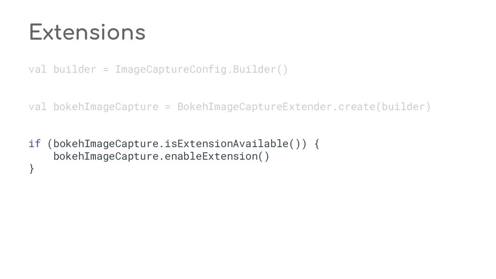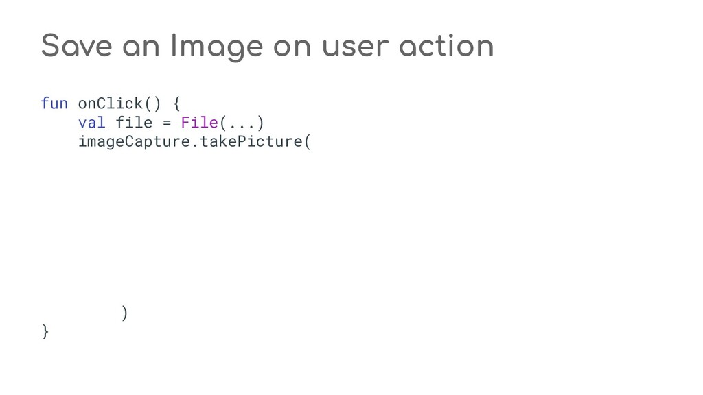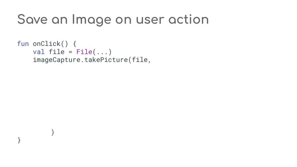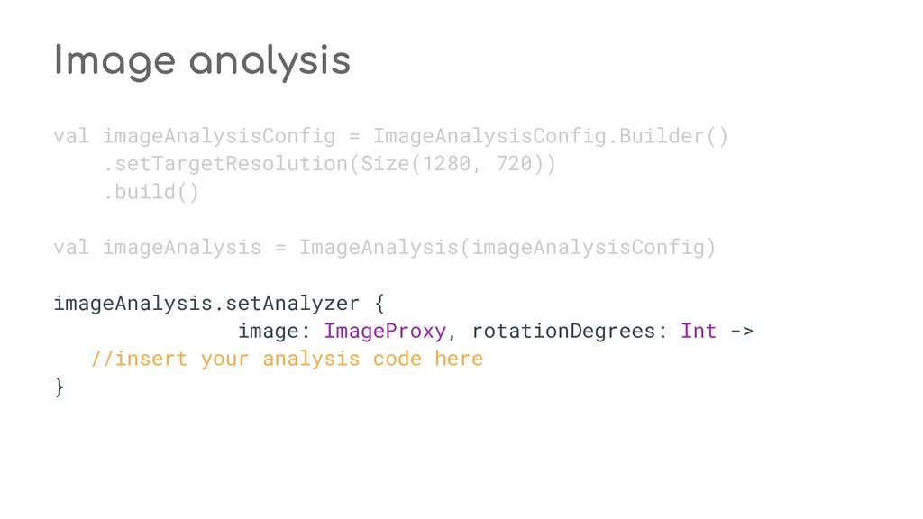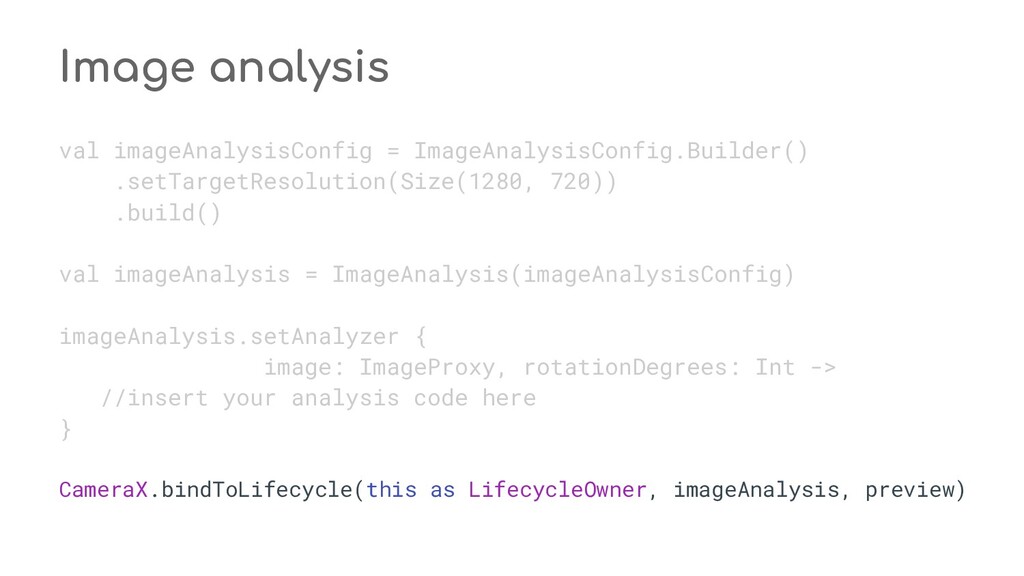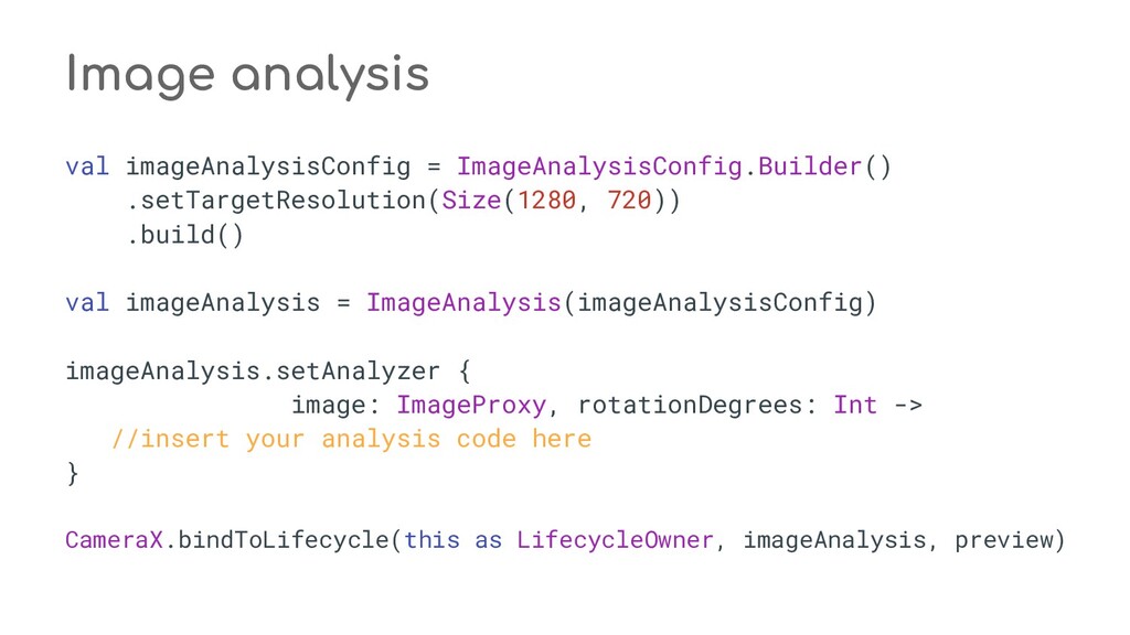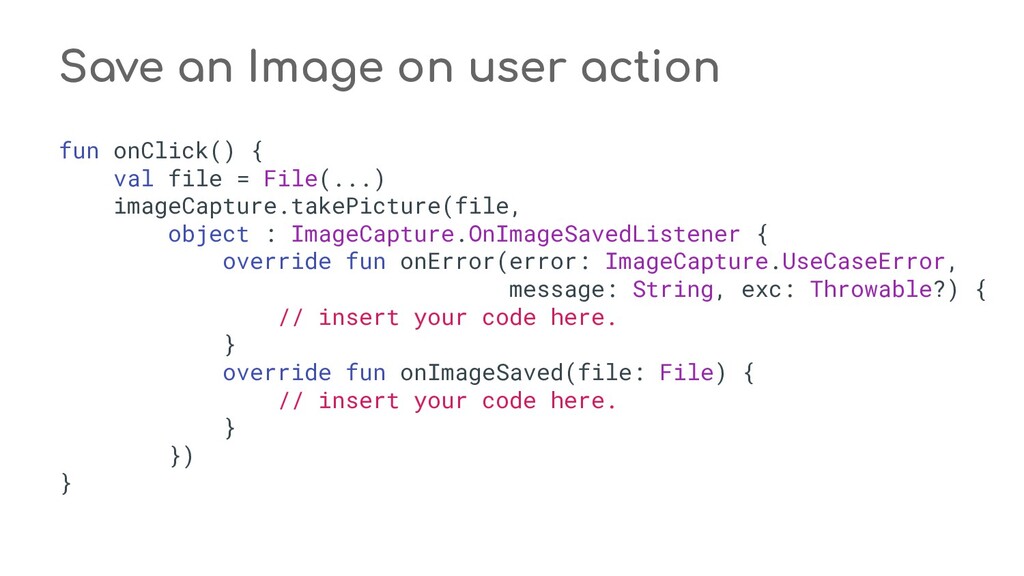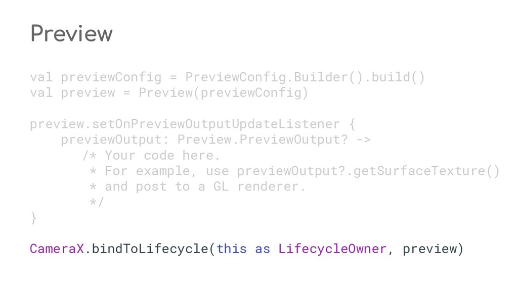 fun process(result: CaptureResult) { when (state) { STATE_PREVIEW -> Unit // Do nothing when the camera preview is working normally. STATE_WAITING_LOCK -> capturePicture(result) STATE_WAITING_PRECAPTURE -> { // CONTROL_AE_STATE can be null on some devices val aeState = result.get(CaptureResult.CONTROL_AE_STATE) if (aeState == null || aeState == CaptureResult.CONTROL_AE_STATE_PRECAPTURE || aeState == CaptureRequest.CONTROL_AE_STATE_FLASH_REQUIRED) { state = STATE_WAITING_NON_PRECAPTURE } } STATE_WAITING_NON_PRECAPTURE -> { // CONTROL_AE_STATE can be null on some devices val aeState = result.get(CaptureResult.CONTROL_AE_STATE) if (aeState == null || aeState != CaptureResult.CONTROL_AE_STATE_PRECAPTURE) { state = STATE_PICTURE_TAKEN captureStillPicture() } } } } private fun capturePicture(result: CaptureResult) { val afState = result.get(CaptureResult.CONTROL_AF_STATE) if (afState == null) { captureStillPicture() } else if (afState == CaptureResult.CONTROL_AF_STATE_FOCUSED_LOCKED || afState == CaptureResult.CONTROL_AF_STATE_NOT_FOCUSED_LOCKED) { // CONTROL_AE_STATE can be null on some devices val aeState = result.get(CaptureResult.CONTROL_AE_STATE) if (aeState == null || aeState == CaptureResult.CONTROL_AE_STATE_CONVERGED) { state = STATE_PICTURE_TAKEN captureStillPicture() } else { runPrecaptureSequence() } } } override fun onCaptureProgressed(session: CameraCaptureSession, request: CaptureRequest, partialResult: CaptureResult) { process(partialResult) } override fun onCaptureCompleted(session: CameraCaptureSession, request: CaptureRequest, result: TotalCaptureResult) { process(result) } } override fun onCreateView(inflater: LayoutInflater, container: ViewGroup?, savedInstanceState: Bundle? ): View? = inflater.inflate(R.layout.fragment_camera2_basic, container, false) override fun onViewCreated(view: View, savedInstanceState: Bundle?) { view.findViewById<View>(R.id.picture).setOnClickListener(this) view.findViewById<View>(R.id.info).setOnClickListener(this) textureView = view.findViewById(R.id.texture) } override fun onActivityCreated(savedInstanceState: Bundle?) { super.onActivityCreated(savedInstanceState) file = File(activity.getExternalFilesDir(null), PIC_FILE_NAME) } nsor coordinate * @param maxWidth The maximum width that can be chosen * @param maxHeight The maximum height that can be chosen * @param aspectRatio The aspect ratio * @return The optimal `Size`, or an arbitrary one if none were big enough */ @JvmStatic private fun chooseOptimalSize( choices: Array<Size>, textureViewWidth: Int, textureViewHeight: Int, maxWidth: Int, maxHeight: Int, aspectRatio: Size ): Size { // Collect the supported resolutions that are at least as big as the preview Surface val bigEnough = ArrayList<Size>() // Collect the supported resolutions that are smaller than the preview Surface val notBigEnough = ArrayList<Size>() val w = aspectRatio.width val h = aspectRatio.height for (option in choices) { if (option.width <= maxWidth && option.height <= maxHeight && option.height == option.width * h / w) { if (option.width >= textureViewWidth && option.height >= textureViewHeight) { bigEnough.add(option) } else { notBigEnough.add(option) } } } // Pick the smallest of those big enough. If there is no one big enough, pick the // largest of those not big enough. if (bigEnough.size > 0) { return Collections.min(bigEnough, CompareSizesByArea()) } else if (notBigEnough.size > 0) { return Collections.max(notBigEnough, CompareSizesByArea()) } else { Log.e(TAG, "Couldn't find any suitable preview size") return choices[0] } } @JvmStatic fun newInstance(): Camera2BasicFragment = Camera2BasicFragment() } } override fun onResume() { super.onResume() startBackgroundThread() // When the screen is turned off and turned back on, the SurfaceTexture is already // available, and "onSurfaceTextureAvailable" will not be called. In that case, we can open // a camera and start preview from here (otherwise, we wait until the surface is ready in // the SurfaceTextureListener). if (textureView.isAvailable) { openCamera(textureView.width, textureView.height) } else { textureView.surfaceTextureListener = surfaceTextureListener } } override fun onPause() { closeCamera() stopBackgroundThread() super.onPause() } private fun requestCameraPermission() { if (shouldShowRequestPermissionRationale(Manifest.permission.CAMERA)) { ConfirmationDialog().show(childFragmentManager, FRAGMENT_DIALOG) } else { requestPermissions(arrayOf(Manifest.permission.CAMERA), REQUEST_CAMERA_PERMISSION) } } override fun onRequestPermissionsResult(requestCode: Int, permissions: Array<String>, grantResults: IntArray) { if (requestCode == REQUEST_CAMERA_PERMISSION) { if (grantResults.size != 1 || grantResults[0] != PackageManager.PERMISSION_GRANTED) { ErrorDialog.newInstance(getString(R.string.request_permission)) .show(childFragmentManager, FRAGMENT_DIALOG) } } else { super.onRequestPermissionsResult(requestCode, permissions, grantResults) } } /** * Sets up member variables related to camera. * * @param width The width of available size for camera preview * @param height The height of available size for camera preview */ private fun setUpCameraOutputs(width: Int, height: Int) { val manager = activity.getSystemService(Context.CAMERA_SERVICE) as CameraManager try { for (cameraId in manager.cameraIdList) { val characteristics = manager.getCameraCharacteristics(cameraId) // We don't use a front facing camera in this sample. val cameraDirection = characteristics.get(CameraCharacteristics.LENS_FACING) if (cameraDirection != null && cameraDirection == CameraCharacteristics.LENS_FACING_FRONT) { continue } val map = characteristics.get( CameraCharacteristics.SCALER_STREAM_CONFIGURATION_MAP) ?: continue // For still image captures, we use the largest available size. val largest = Collections.max( Arrays.asList(*map.getOutputSizes(ImageFormat.JPEG)), CompareSizesByArea()) imageReader = ImageReader.newInstance(largest.width, largest.height, ImageFormat.JPEG, /*maxImages*/ 2).apply {