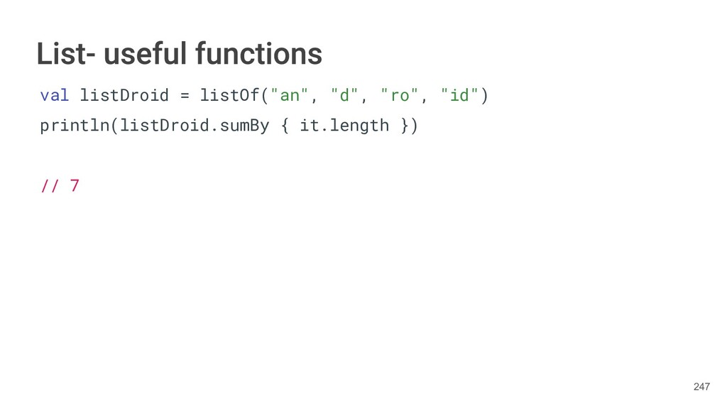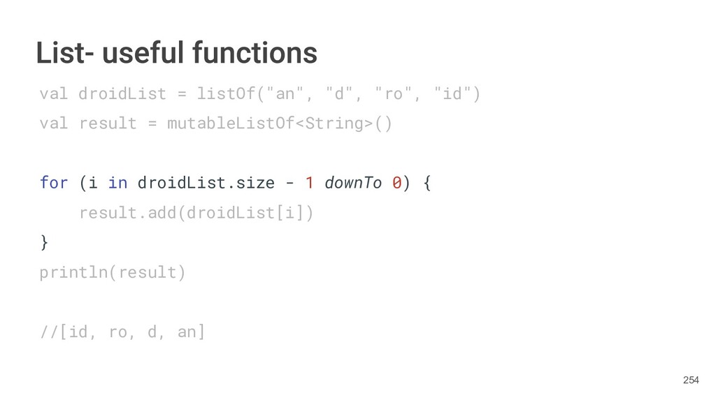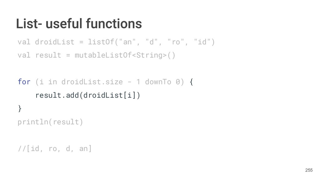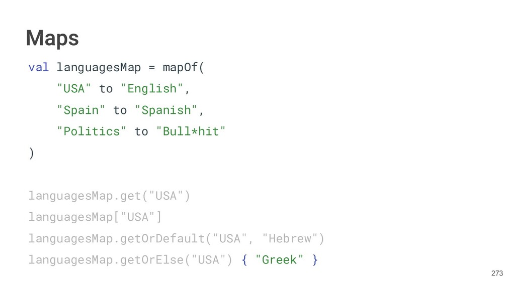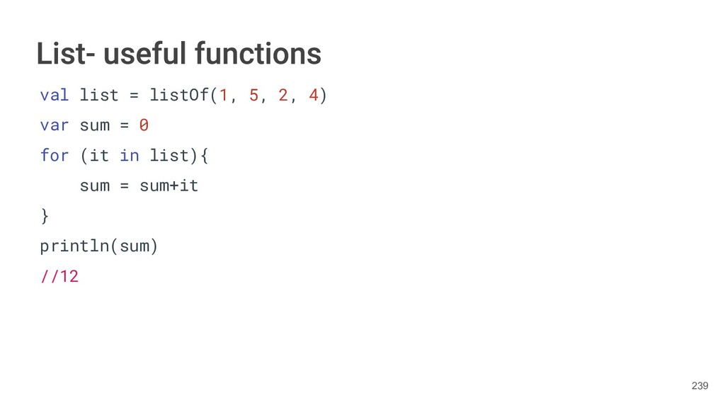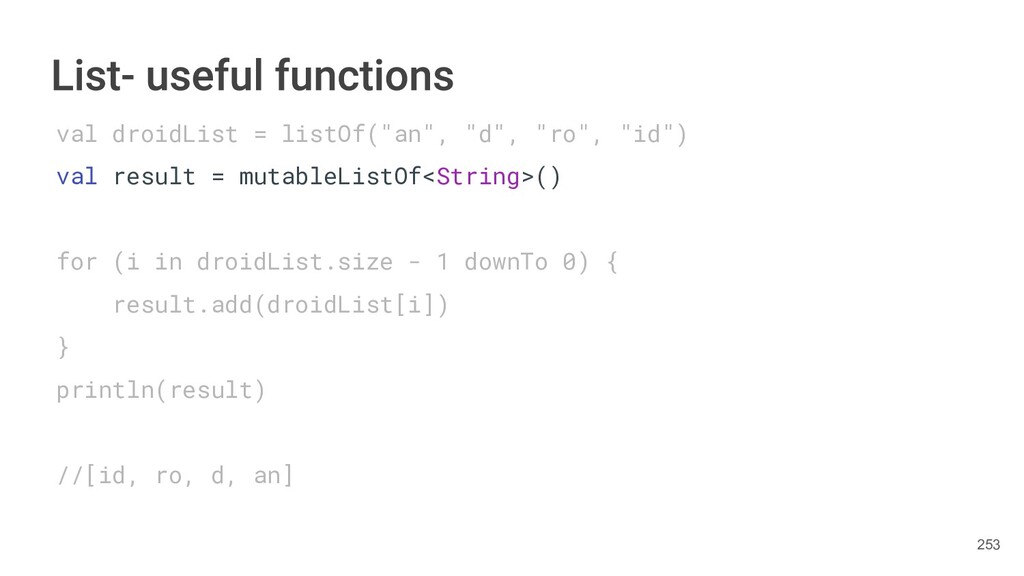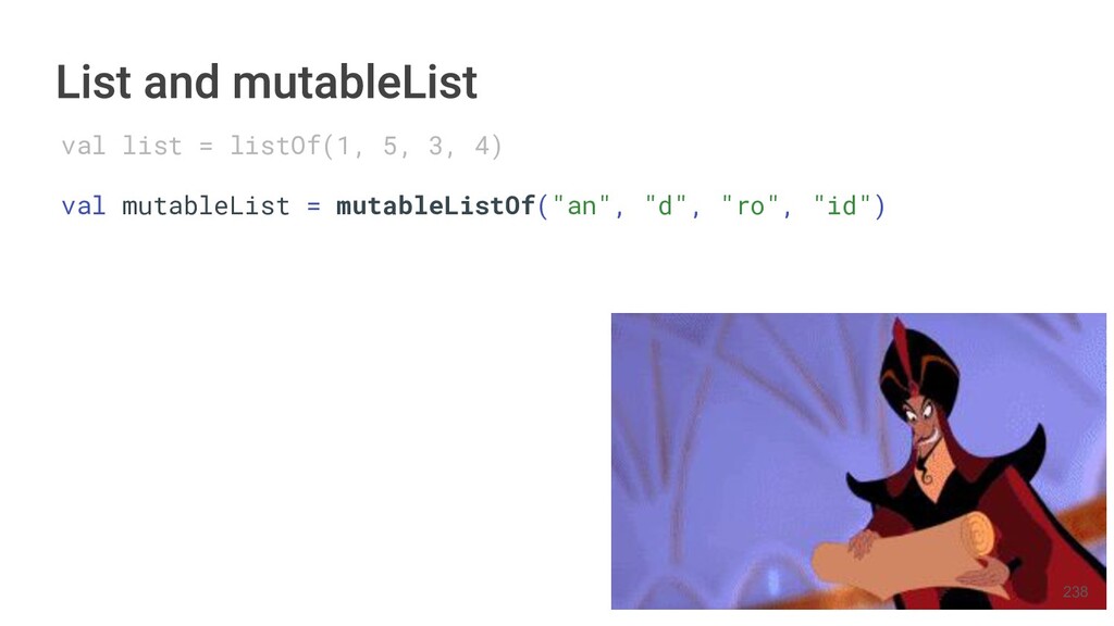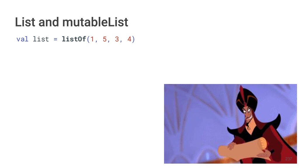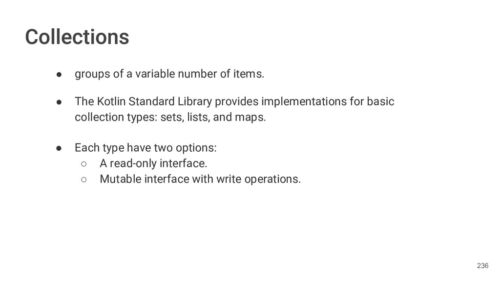 Kotlin Standard Library provides implementations for basic collection types: sets, lists, and maps. • Each type have two options: ◦ A read-only interface. ◦ Mutable interface with write operations. 236