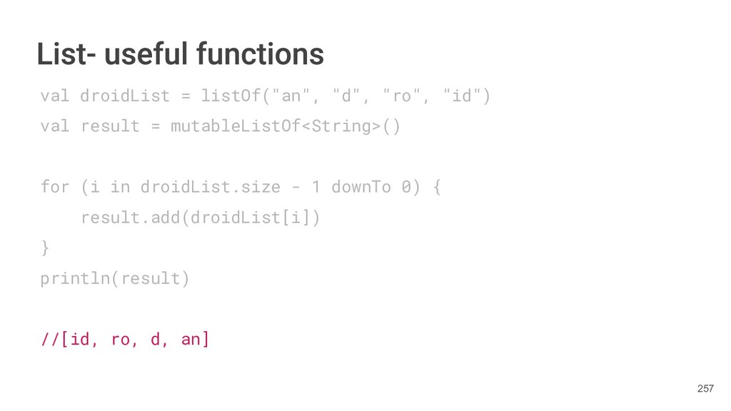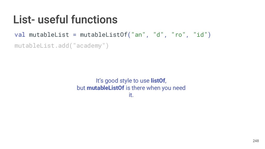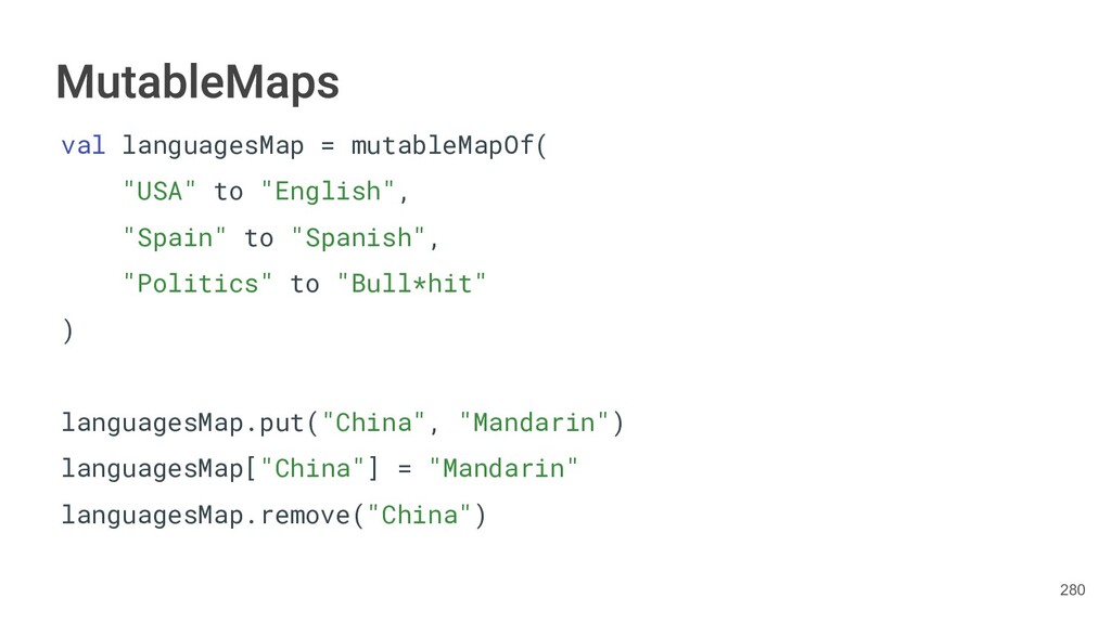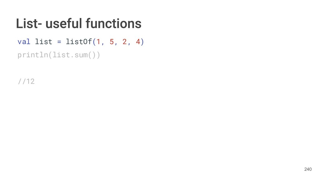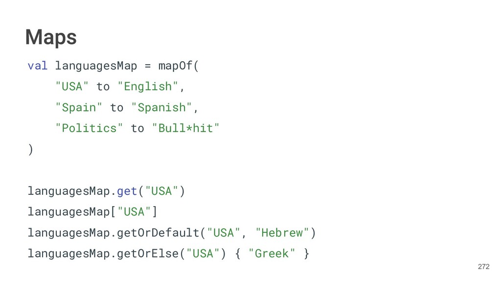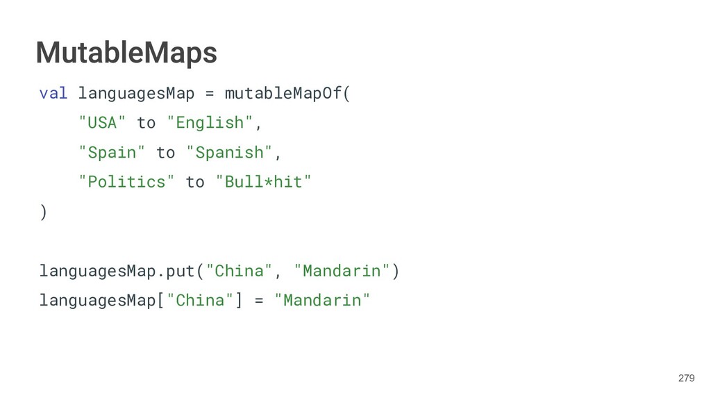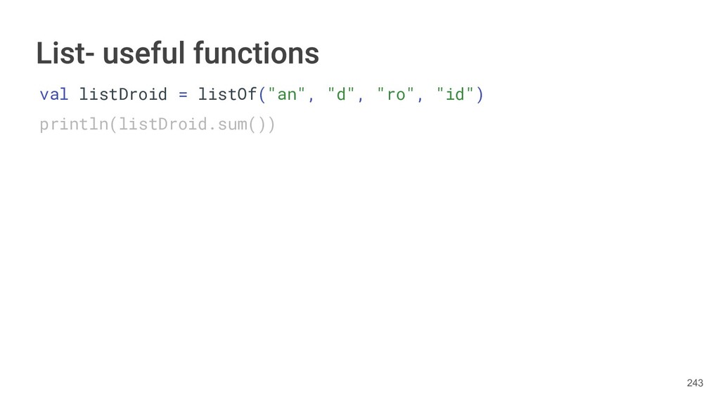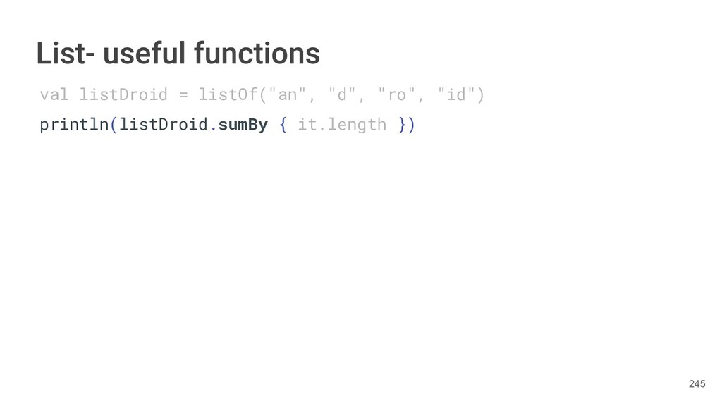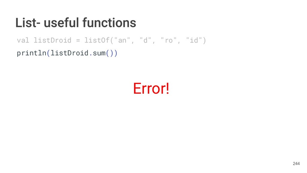 Kotlin Standard Library provides implementations for basic collection types: sets, lists, and maps. • Each type have two options: ◦ A read-only interface. ◦ Mutable interface with write operations. 236