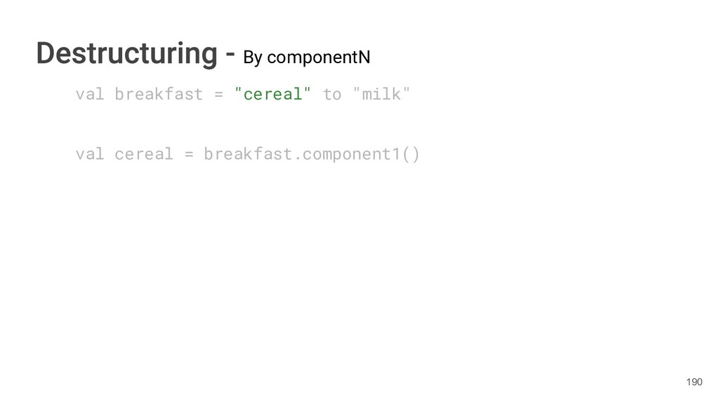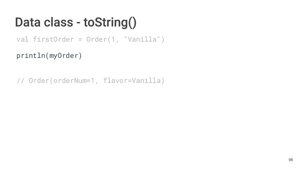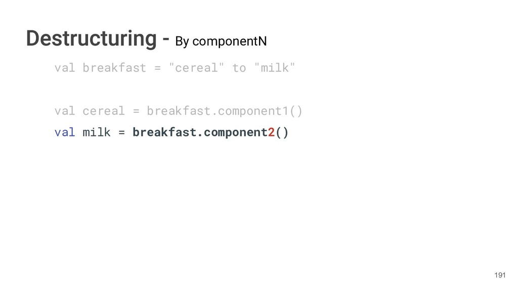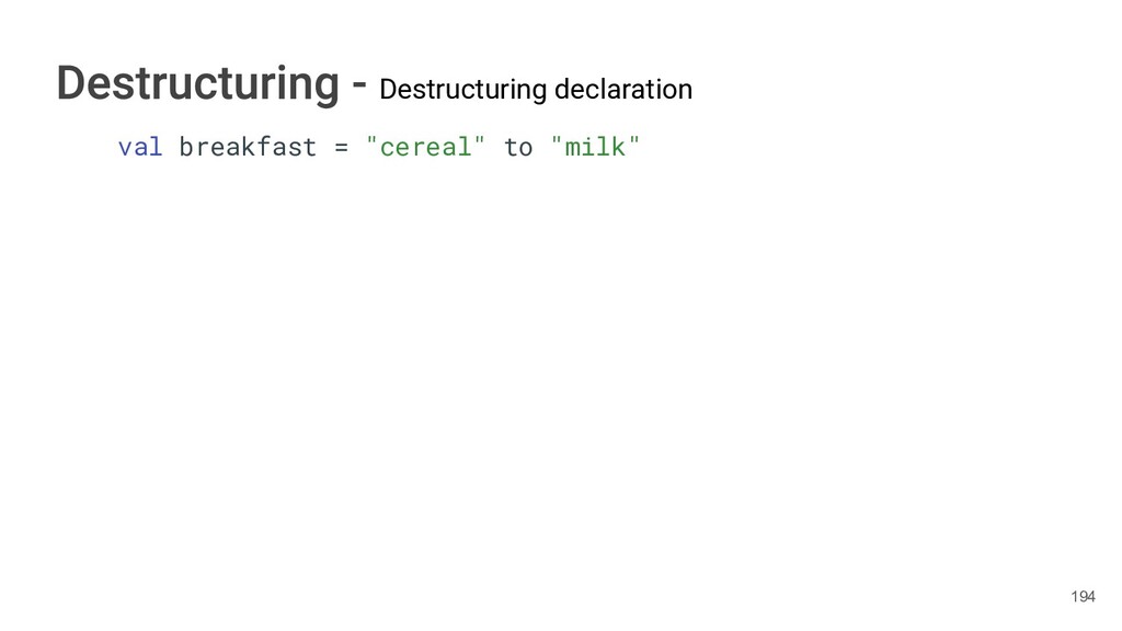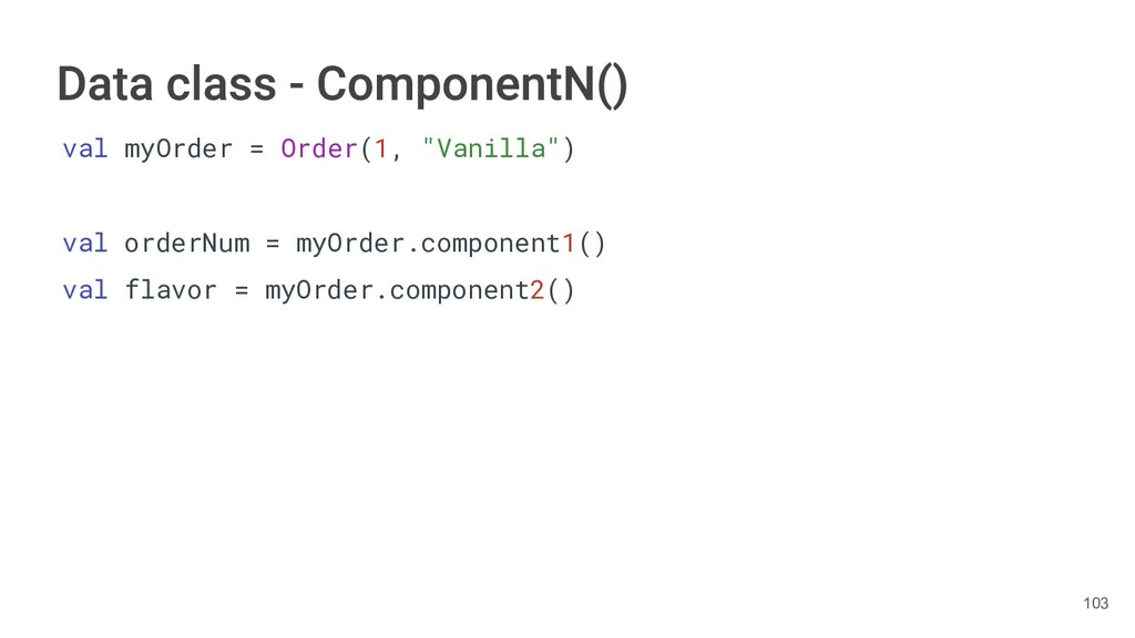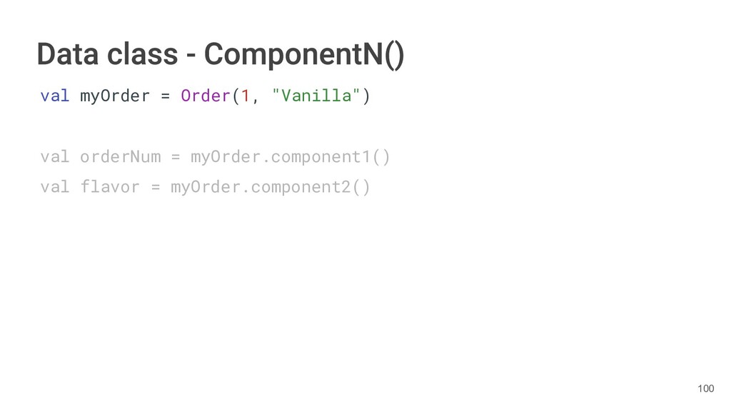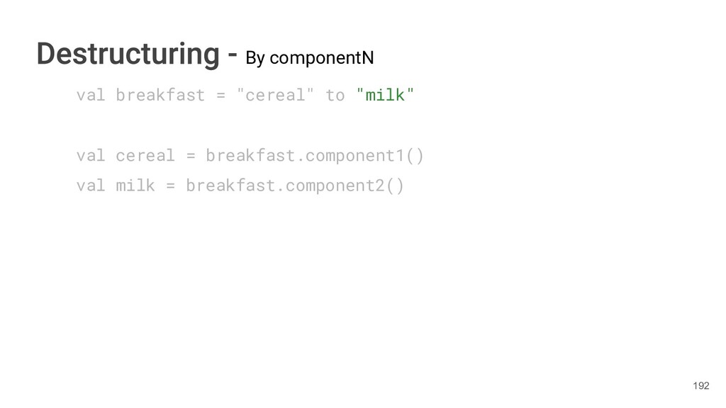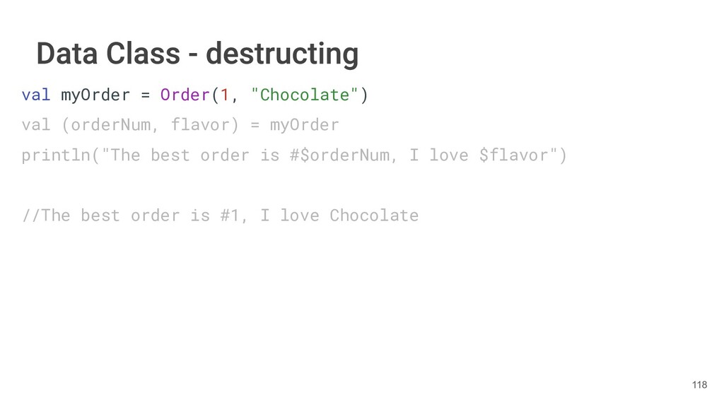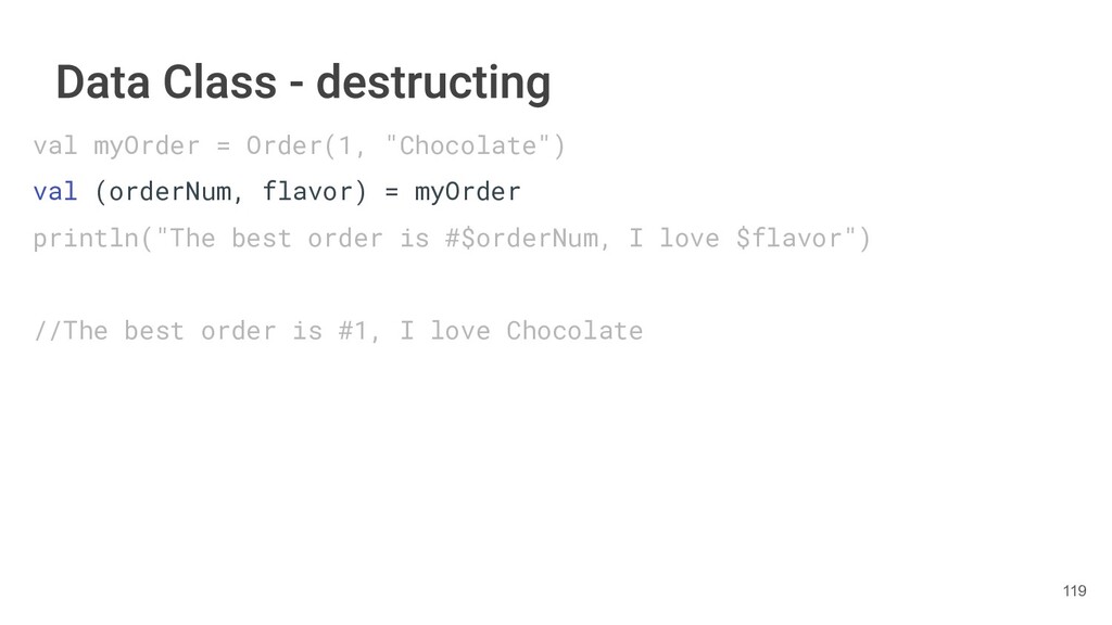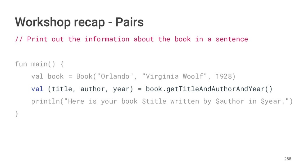 sentence fun main() { val book = Book("Orlando", "Virginia Woolf", 1928) val (title, author, year) = book.getTitleAndAuthorAndYear() println("Here is your book $title written by $author in $year.") } 286