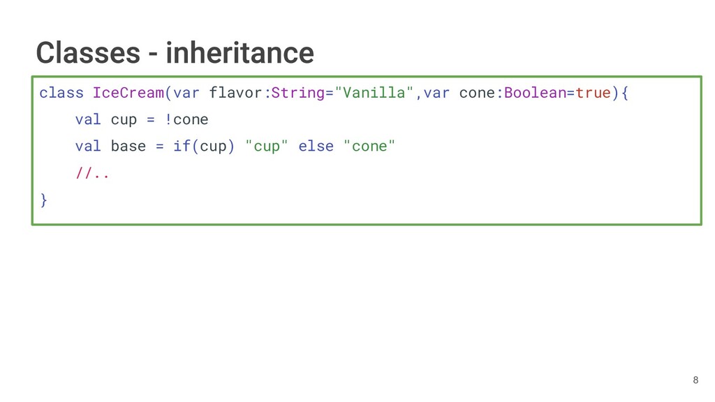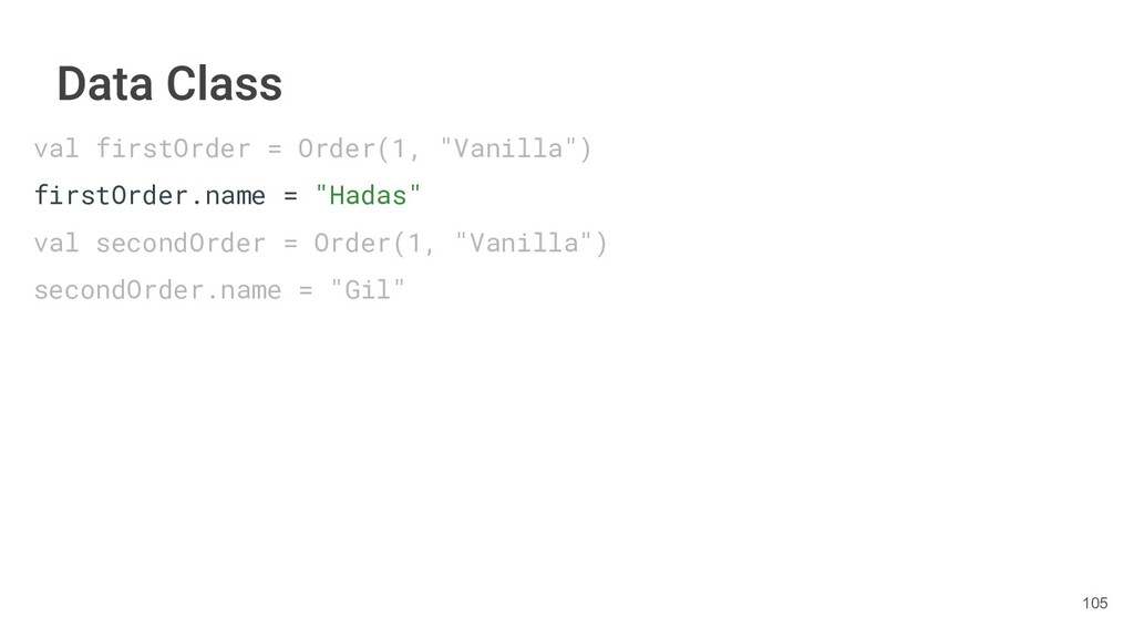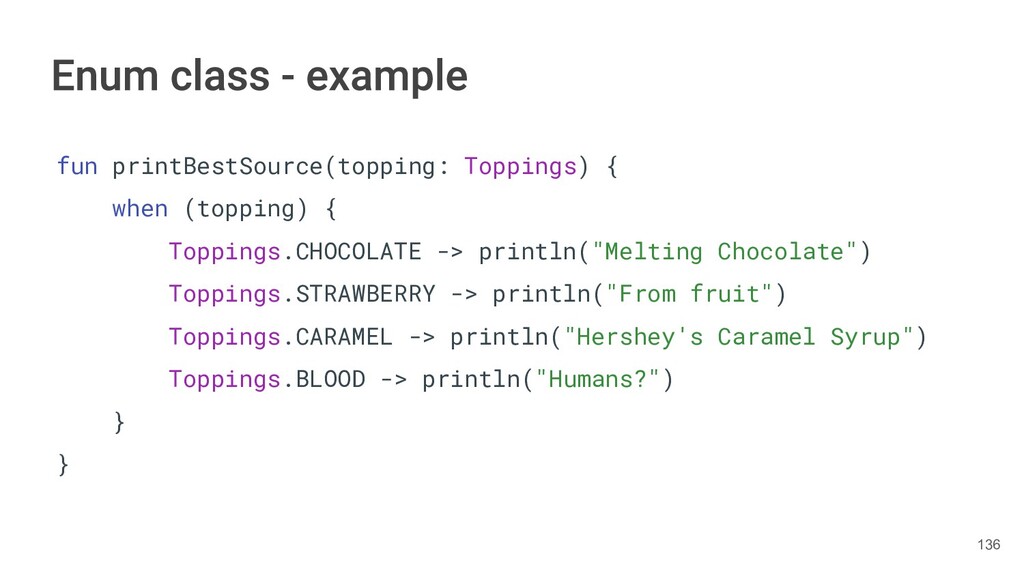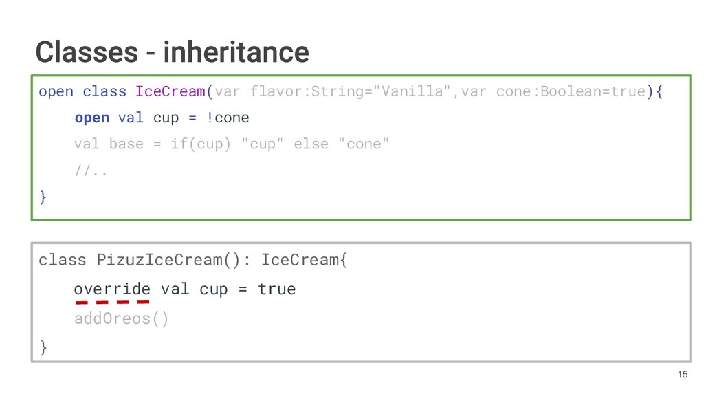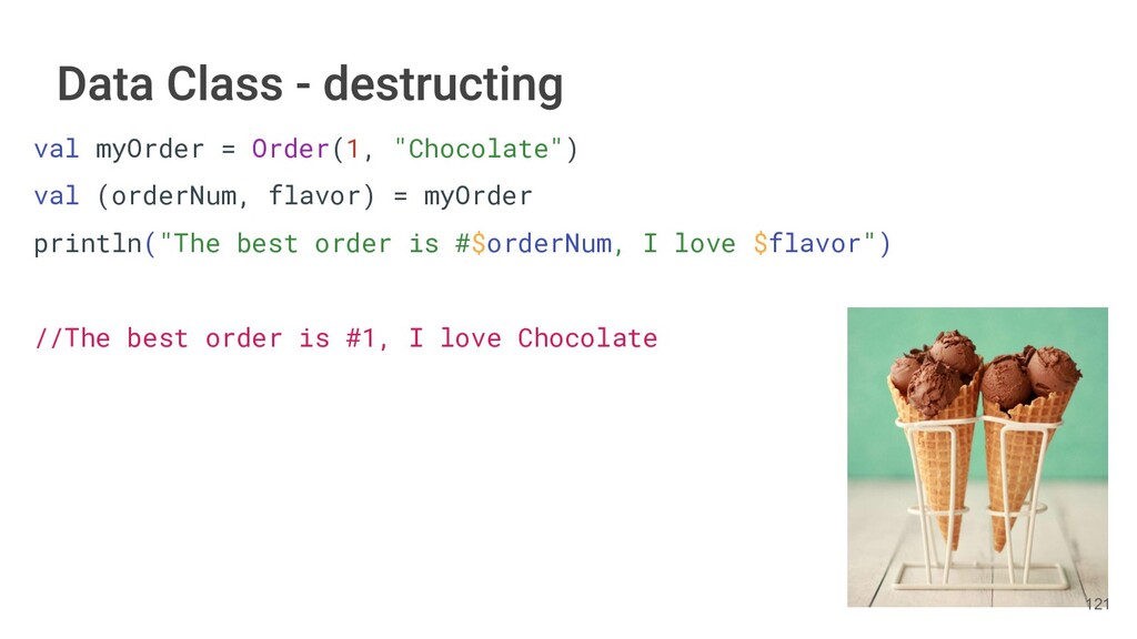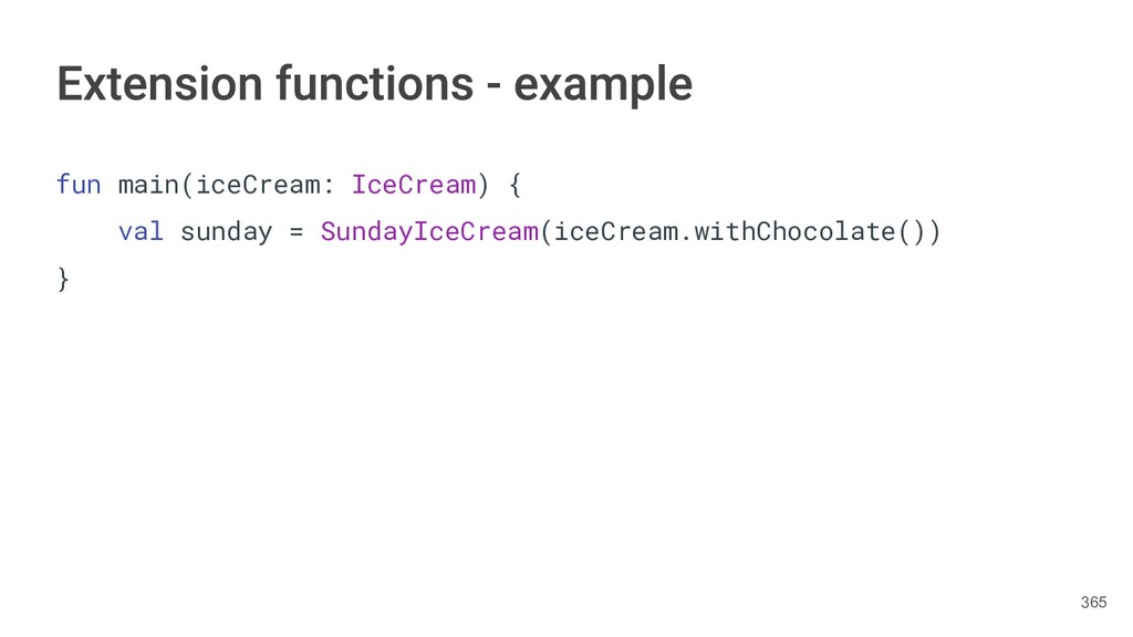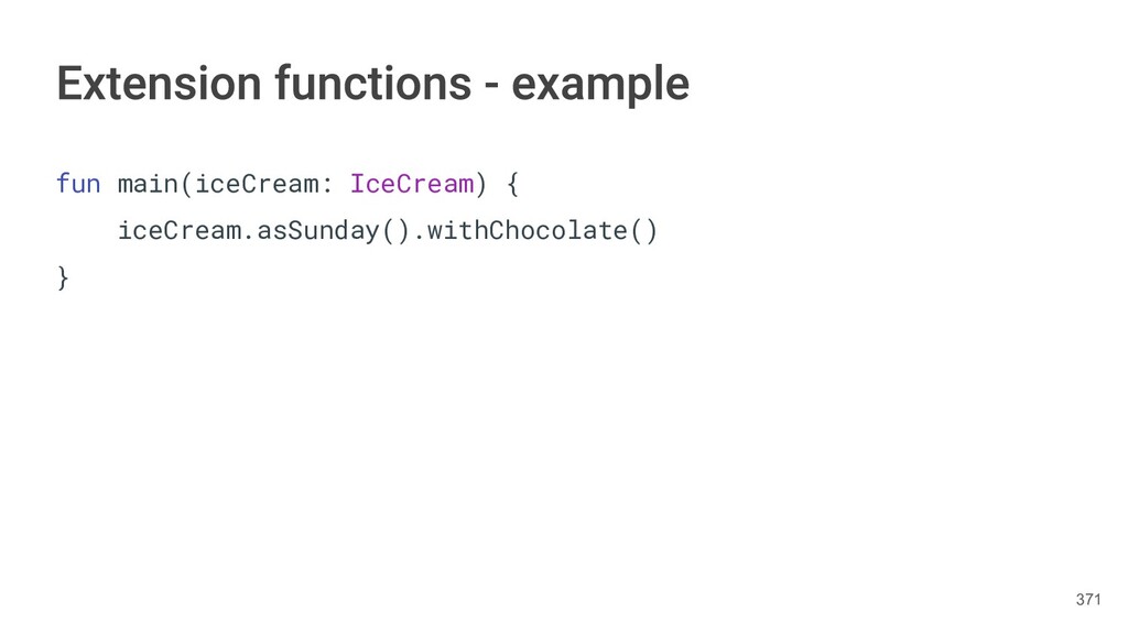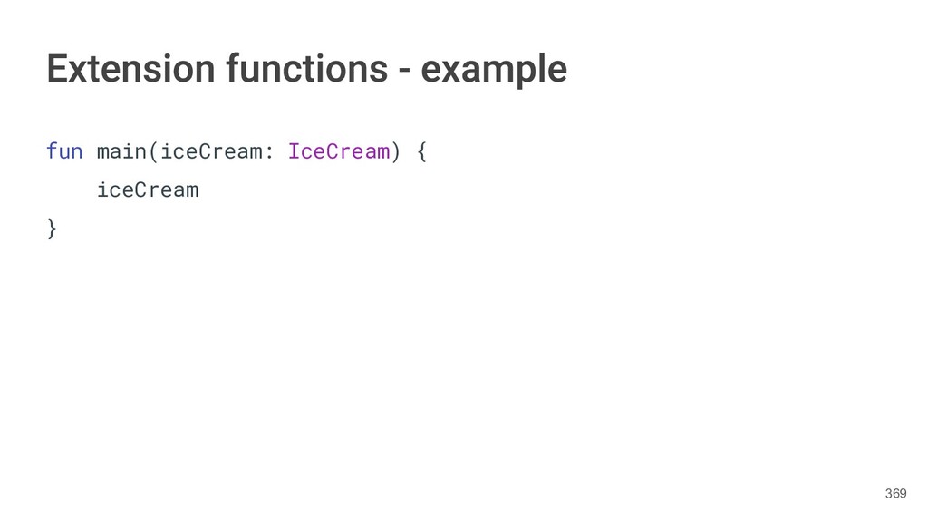 fun findBestIceCream(iceCreams: List<IceCream>): IceCream { val result = IceCream() for(iceCream in iceCreams) { // secret algorithm } return result } 231