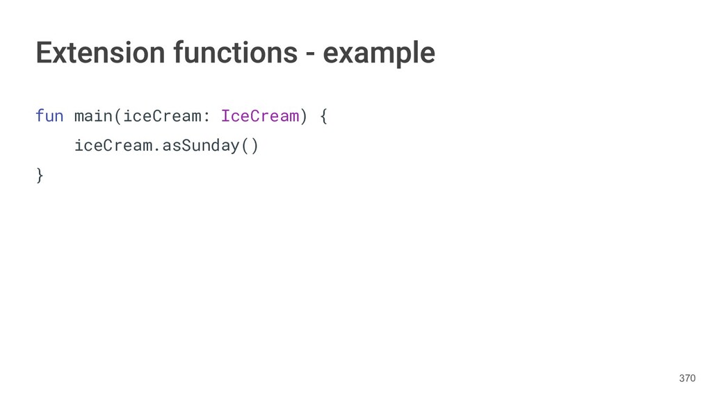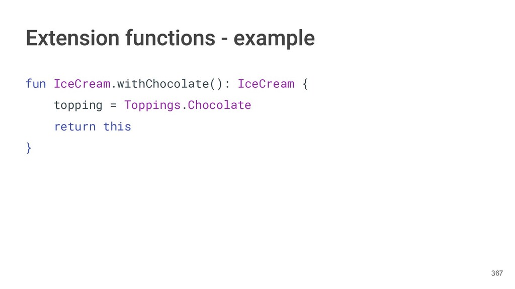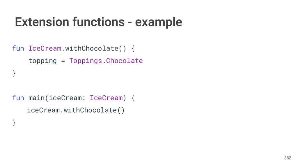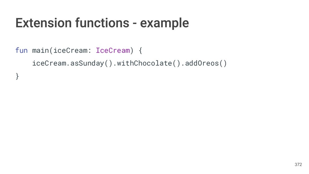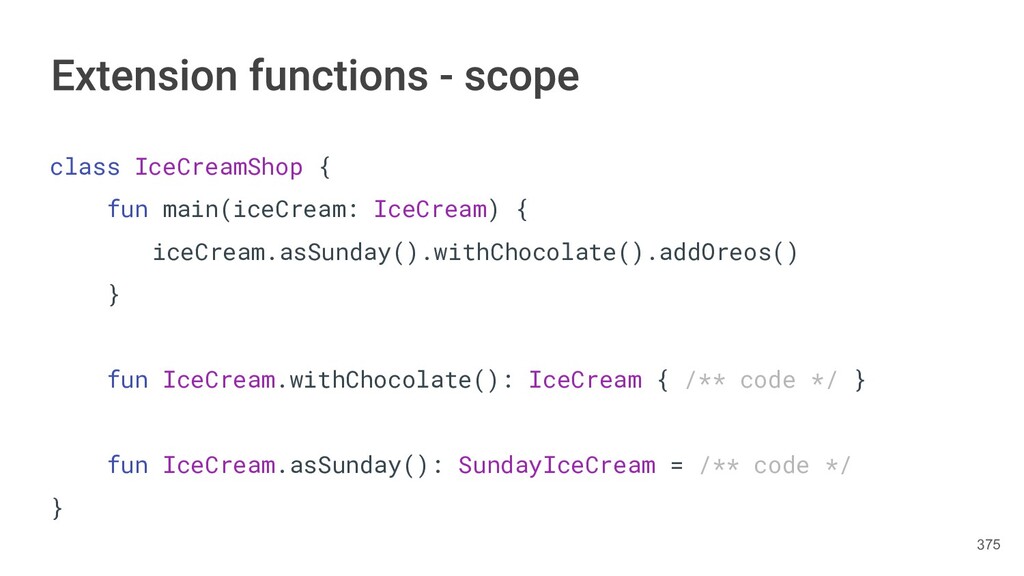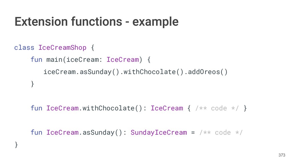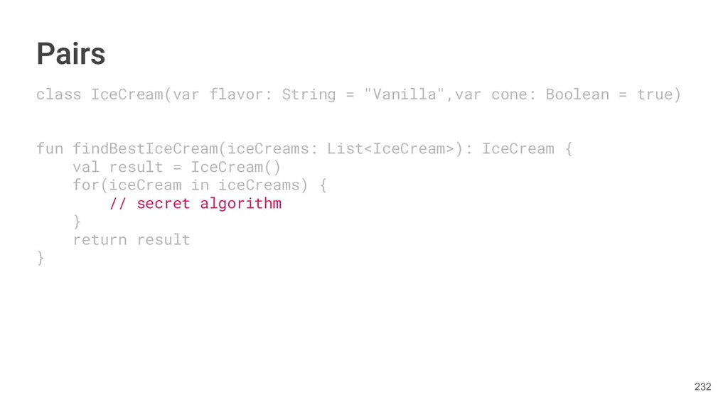fun findBestIceCream(iceCreams: List<IceCream>): IceCream { val result = IceCream() for(iceCream in iceCreams) { // secret algorithm } return result } 232
