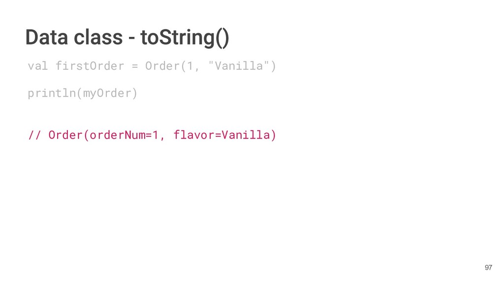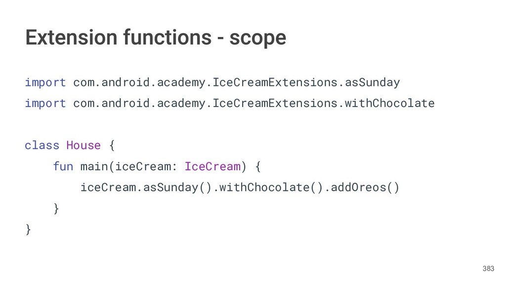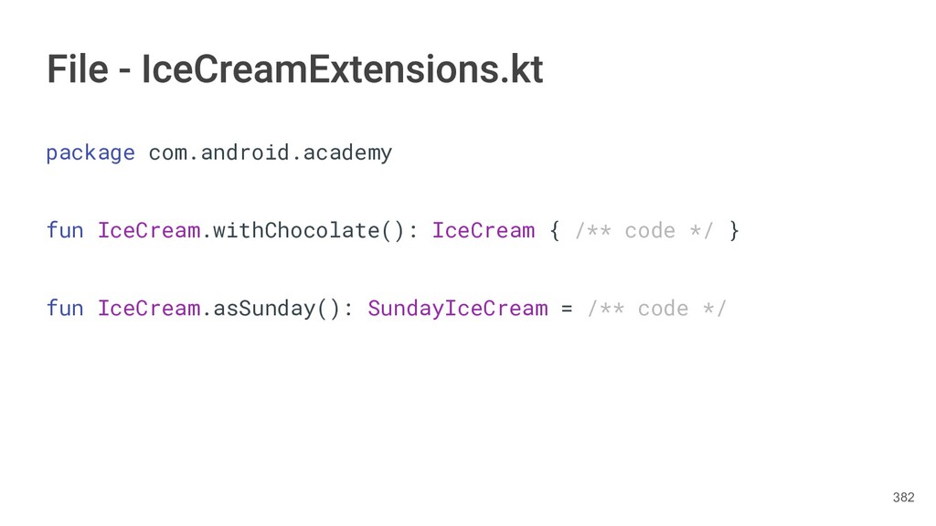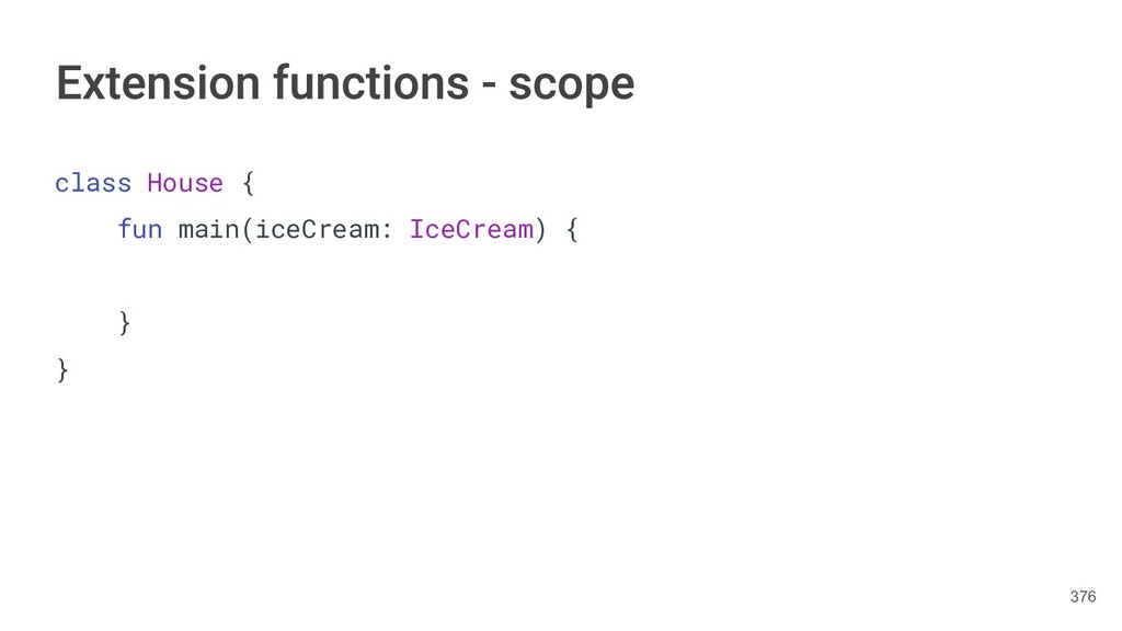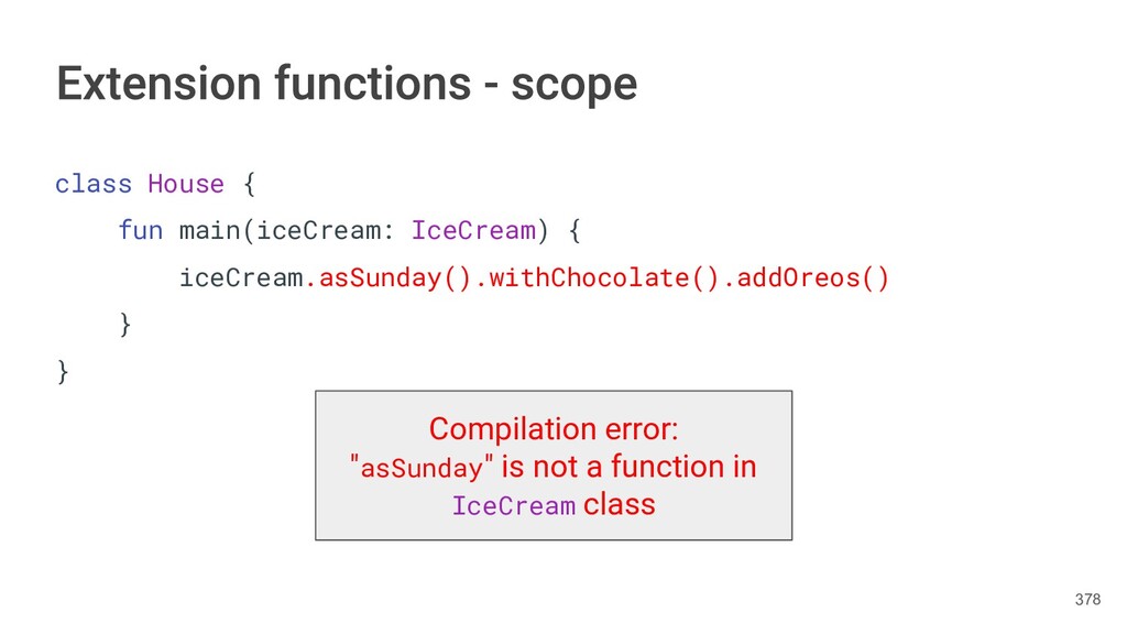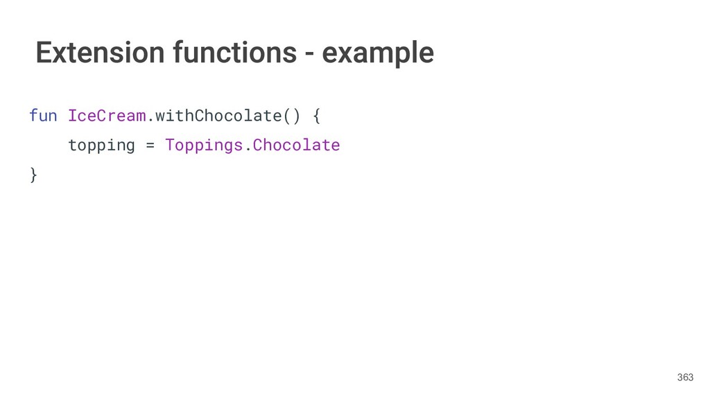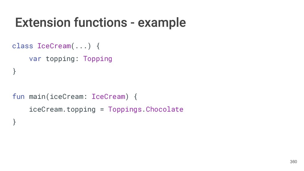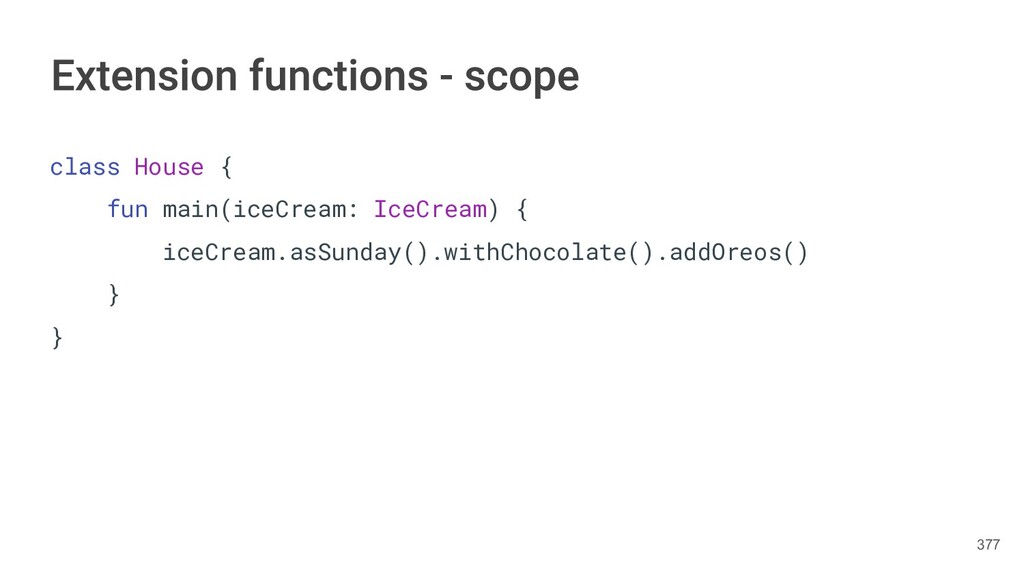 fun findBestIceCream(iceCreams: List<IceCream>): IceCream { val result = IceCream() for(iceCream in iceCreams) { // secret algorithm } return result } 232
