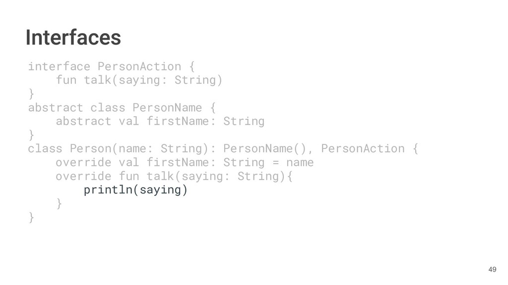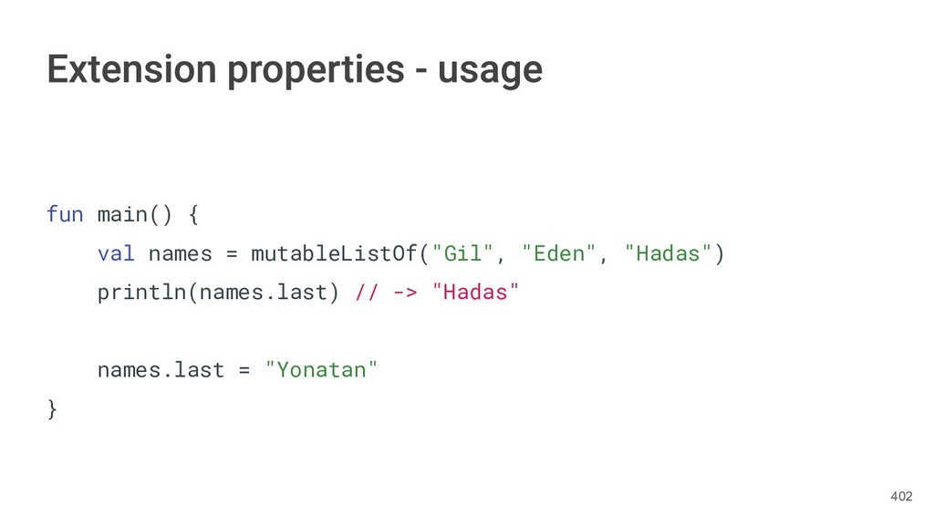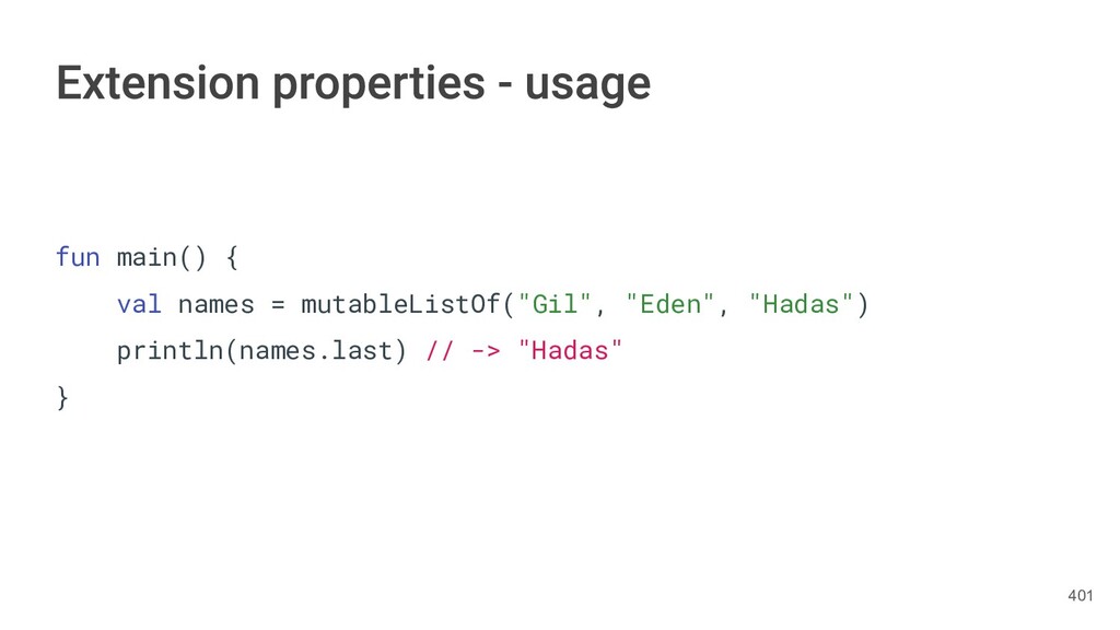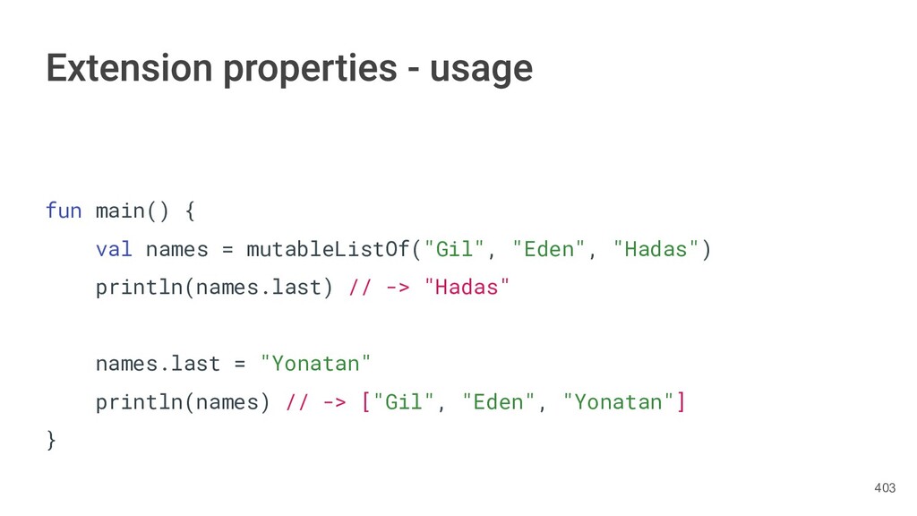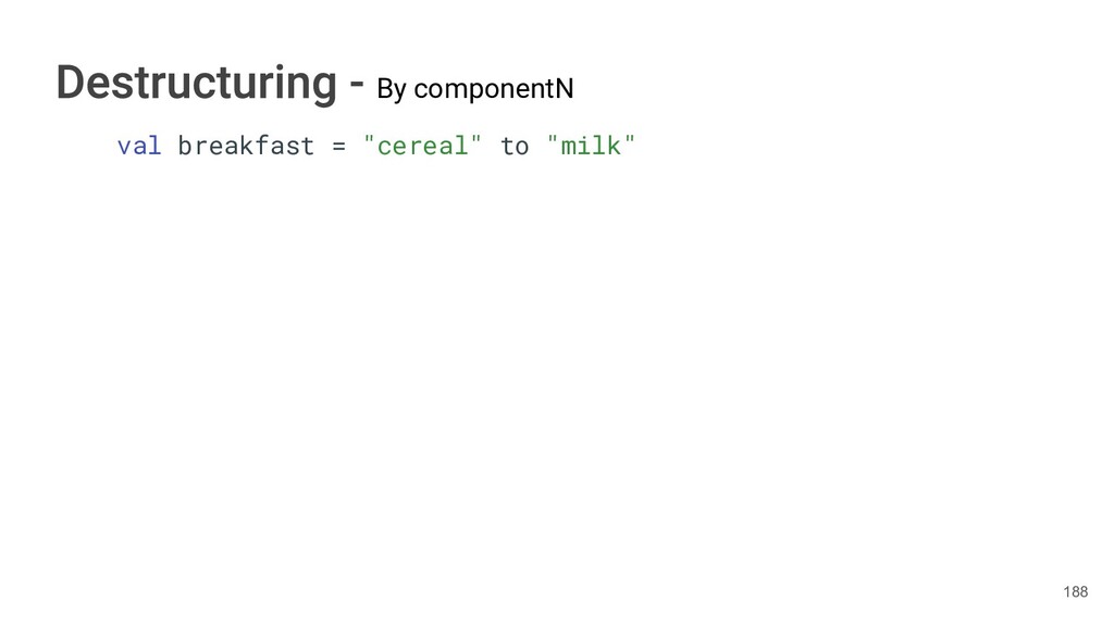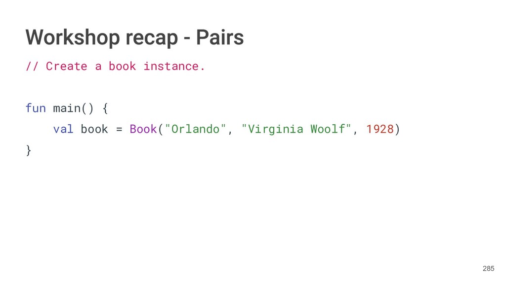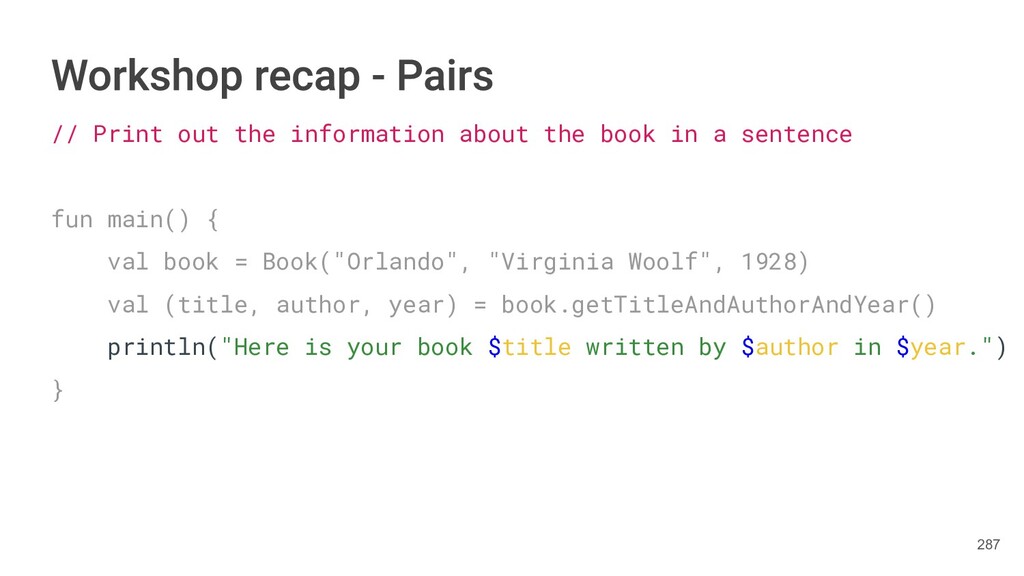 sentence fun main() { val book = Book("Orlando", "Virginia Woolf", 1928) val (title, author, year) = book.getTitleAndAuthorAndYear() println("Here is your book $title written by $author in $year.") } 287