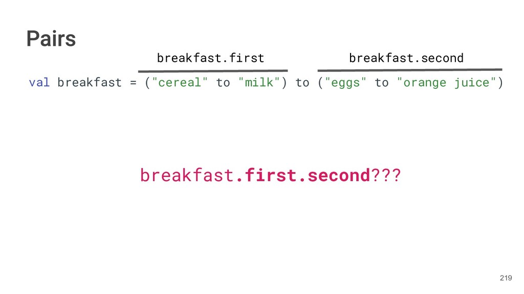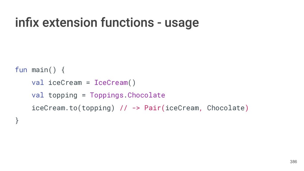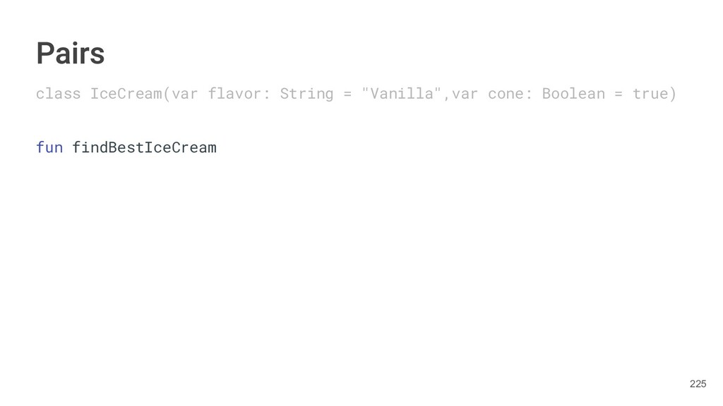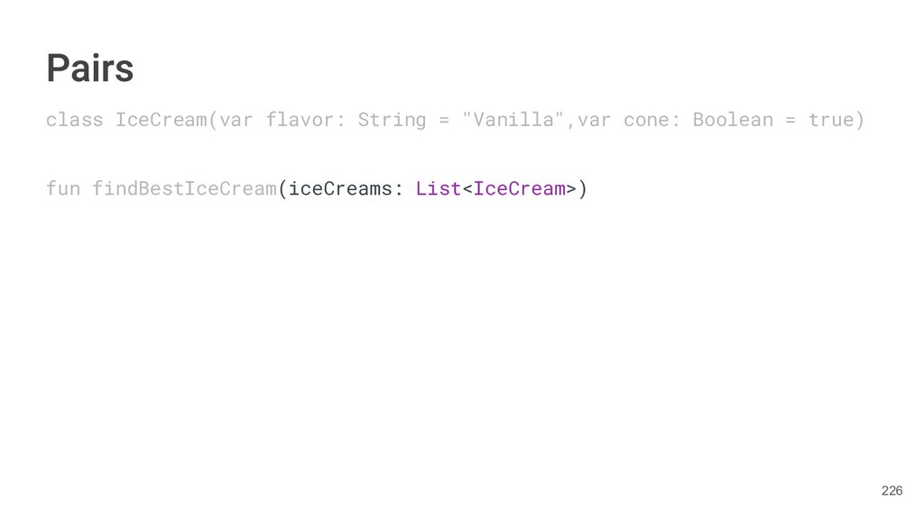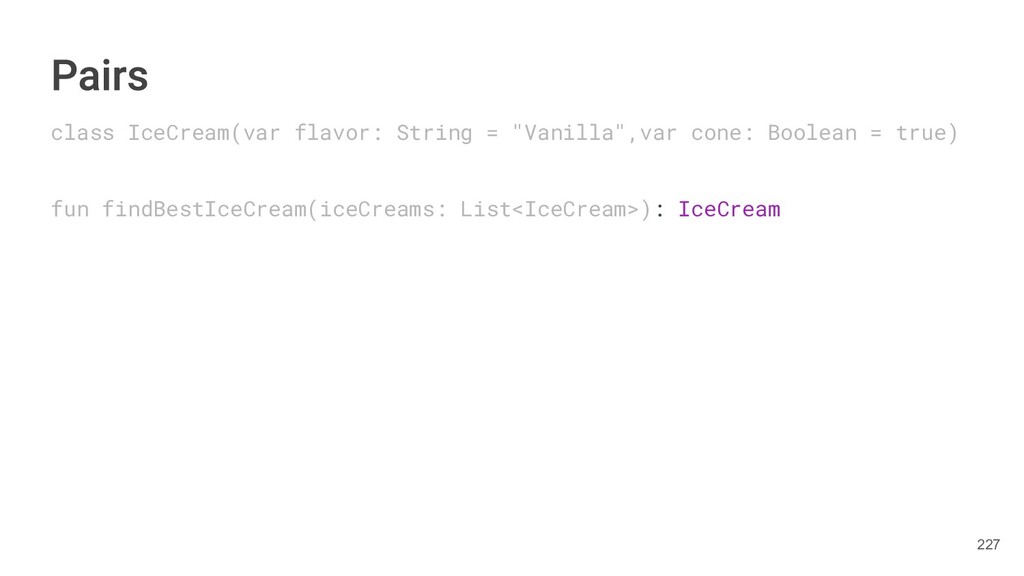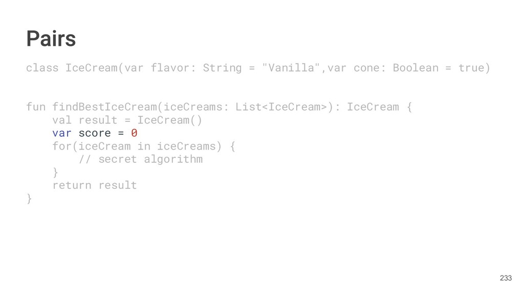 fun findBestIceCream(iceCreams: List<IceCream>): Pair<IceCream, Int> { val result = IceCream() var score = 0 for(iceCream in iceCreams) { // secret algorithm } return result to score } 234