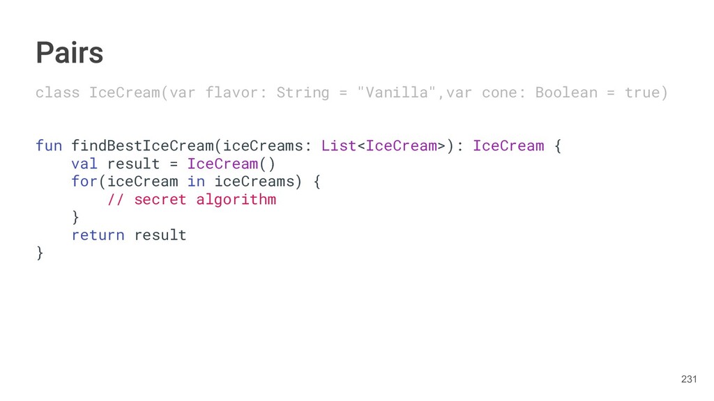 fun findBestIceCream(iceCreams: List<IceCream>): IceCream { val result = IceCream() for(iceCream in iceCreams) { // secret algorithm } return result } 230