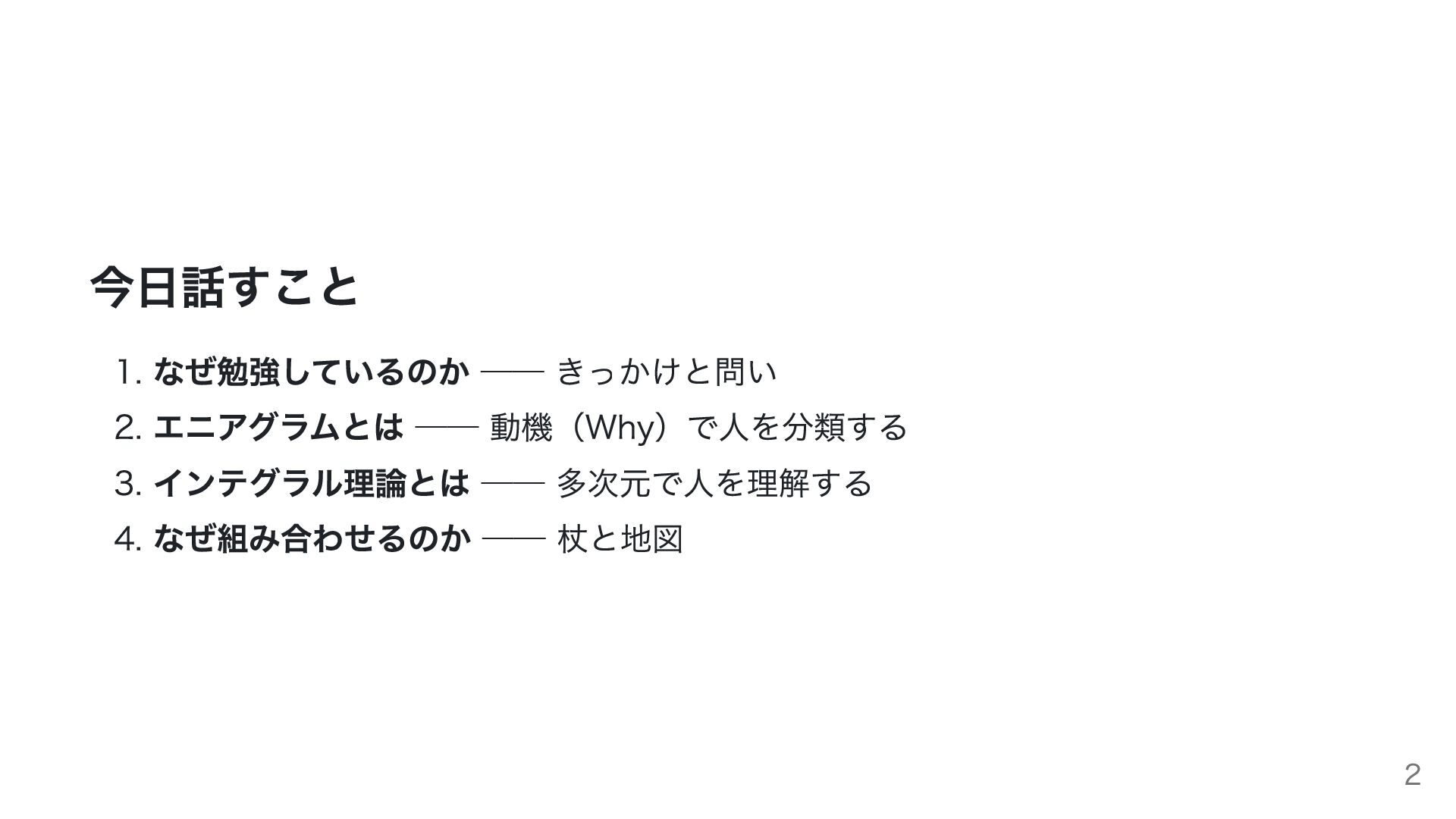 今日話すこと 1. なぜ勉強しているのか ── きっかけと問い 2. エニアグラムとは ── 動機(Why)で人を分類する 3.