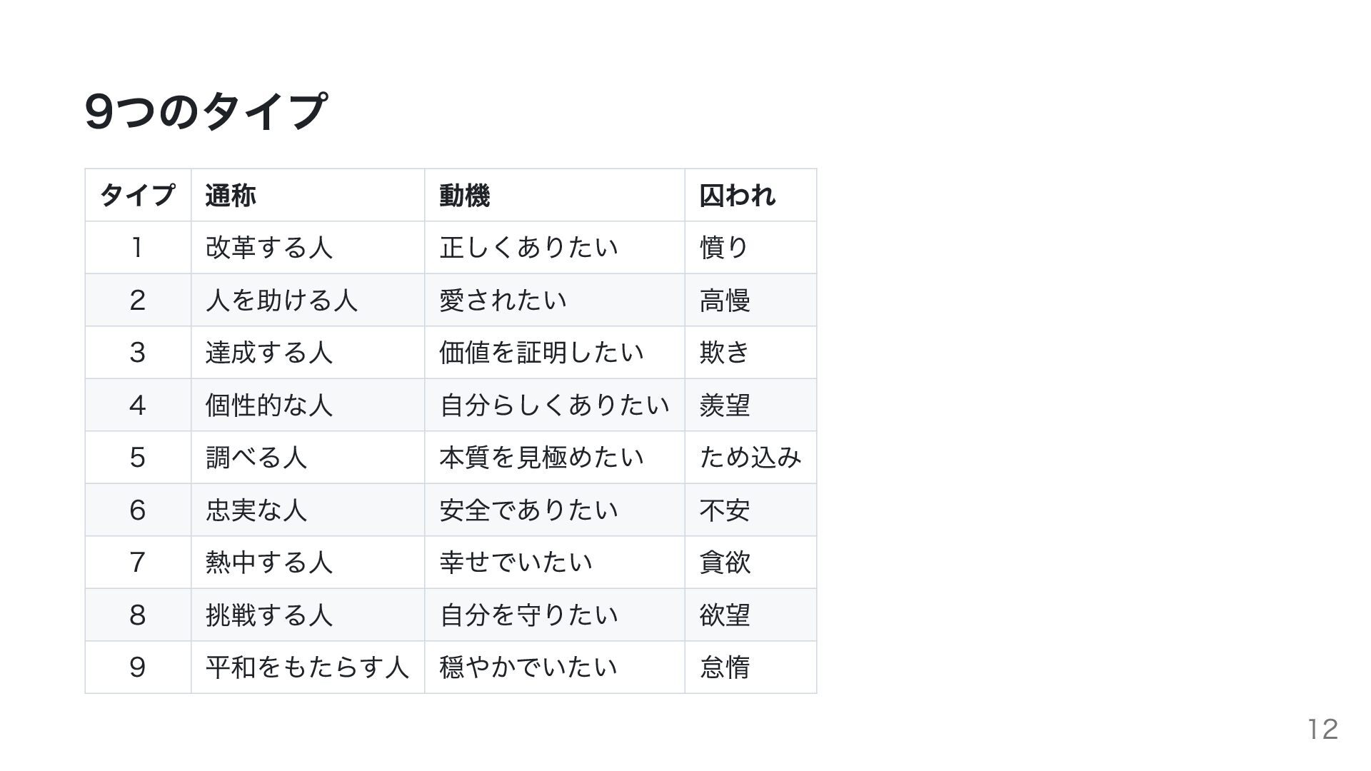 人を助ける人 愛されたい 高慢 3 達成する人 価値を証明したい 欺き 4 個性的な人 自分らしくありたい 羨望 5 調べる人 本質を見極めたい ため込み 6 忠実な人 安全でありたい 不安 7 熱中する人 幸せでいたい 貪欲 8 挑戦する人 自分を守りたい 欲望 9 平和をもたらす人 穏やかでいたい 怠惰 12