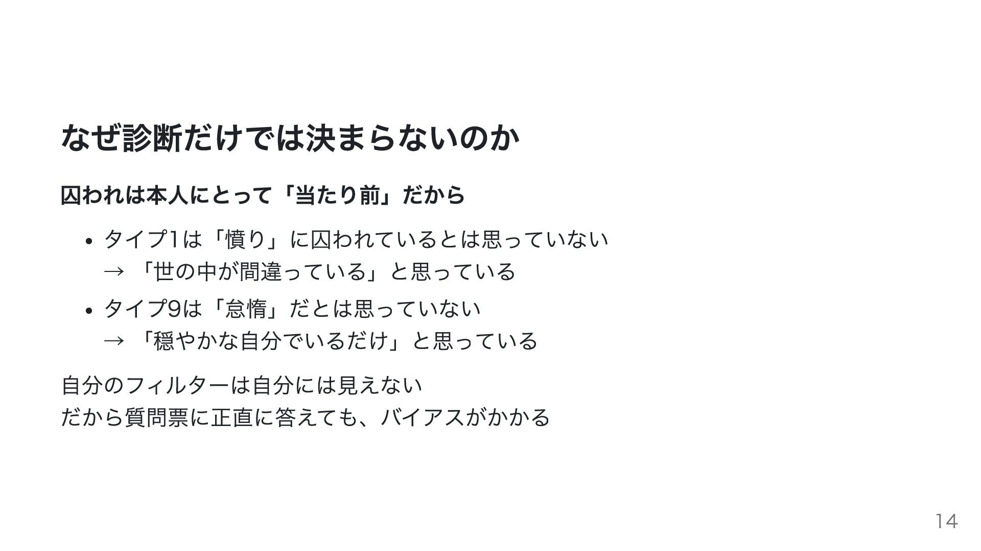 なぜ診断だけでは決まらないのか 囚われは本人にとって「当たり前」だから タイプ1は「憤り」に囚われているとは思っていない → 「世の中が間違っている」と思っている タイプ9は「怠惰」だとは思っていない → 「穏やかな自分でいるだけ」と思っている 自分のフィルターは自分には見えない だから質問票に正直に答えても、バイアスがかかる