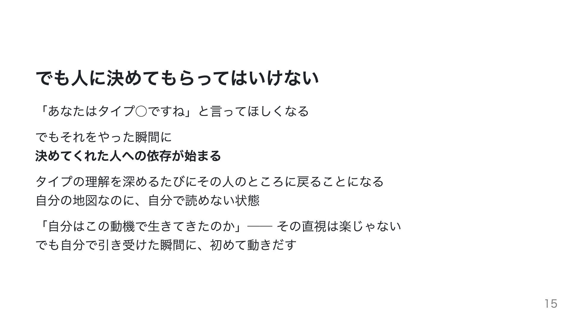 でも人に決めてもらってはいけない 「あなたはタイプ◦ですね」と言ってほしくなる でもそれをやった瞬間に 決めてくれた人への依存が始まる タイプの理解を深めるたびにその人のところに戻ることになる 自分の地図なのに、自分で読めない状態 「自分はこの動機で生きてきたのか」── その直視は楽じゃない でも自分で引き受けた瞬間に、初めて動きだす 15