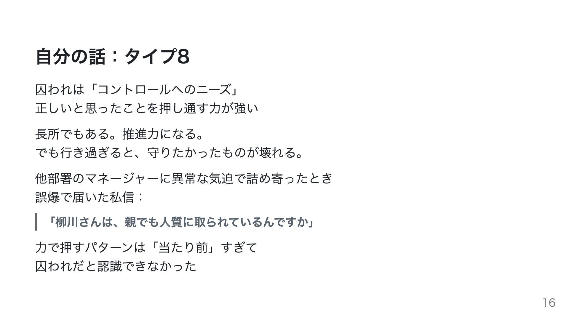 自分の話:タイプ8 囚われは「コントロールへのニーズ」 正しいと思ったことを押し通す力が強い 長所でもある。推進力になる。 でも行き過ぎると、守りたかったものが壊れる。 他部署のマネージャーに異常な気迫で詰め寄ったとき 誤爆で届いた私信: 「柳川さんは、親でも人質に取られているんですか」 力で押すパターンは「当たり前」すぎて 囚われだと認識できなかった