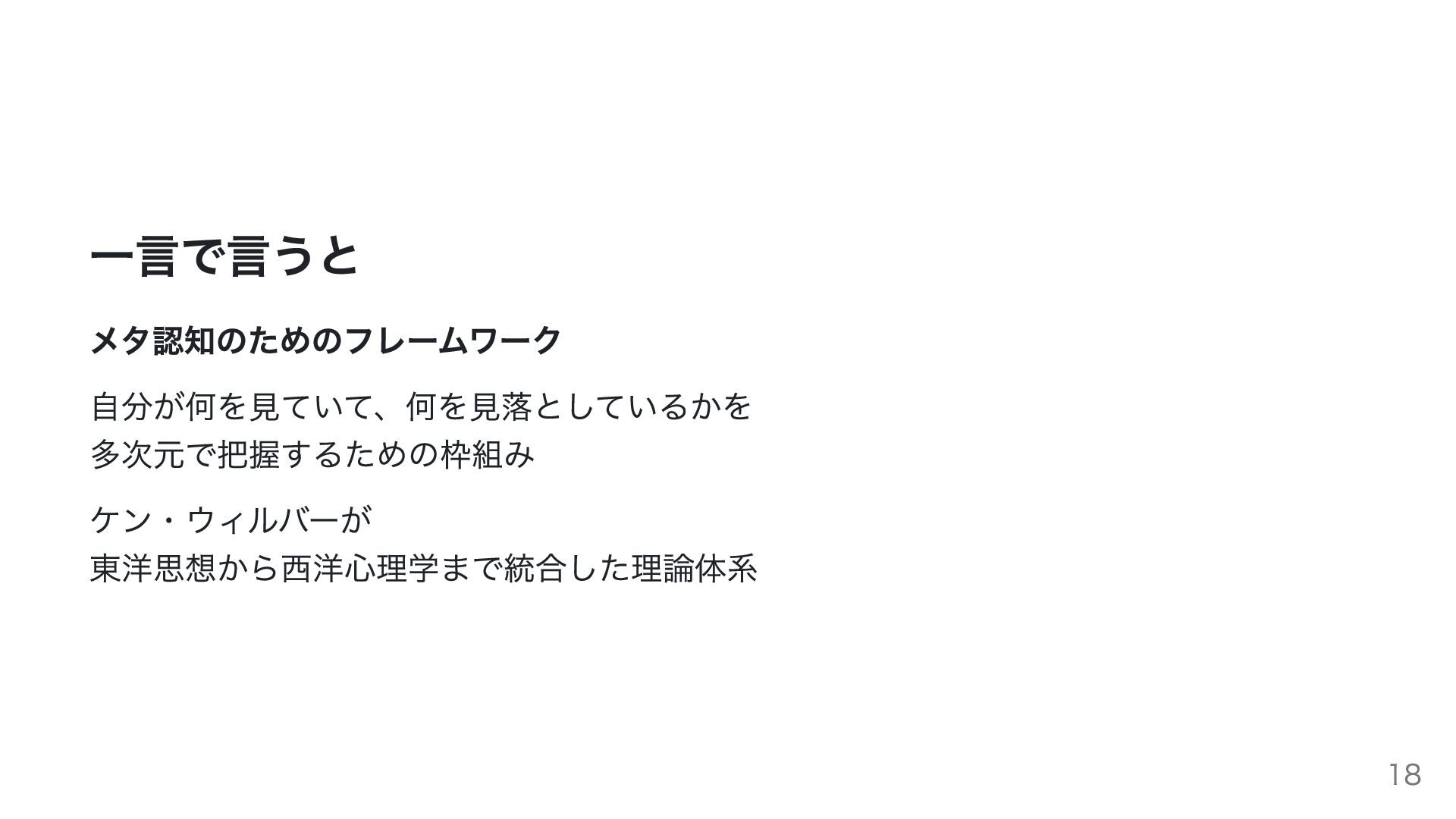 一言で言うと メタ認知のためのフレームワーク 自分が何を見ていて、何を見落としているかを 多次元で把握するための枠組み ケン・ウィルバーが 東洋思想から西洋心理学まで統合した理論体系 18