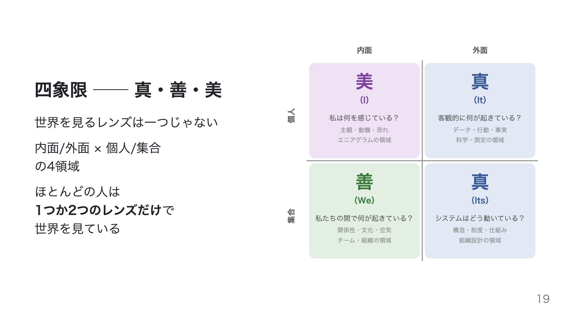 (It) 客観的に何が起きている? データ・⾏動・事実 科学・測定の領域 善 (We) 私たちの間で何が起きている? 関係性・⽂化・空気 チーム・組織の領域 真 (Its) システムはどう動いている? 構造・制度・仕組み 組織設計の領域 四象限 ── 真・善・美 世界を見るレンズは一つじゃない 内面/外面 × 個人/集合 の4領域 ほとんどの人は 1つか2つのレンズだけで 世界を見ている 19