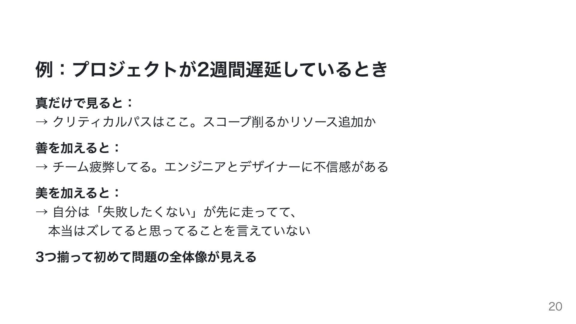 例:プロジェクトが2週間遅延しているとき 真だけで見ると: → クリティカルパスはここ。スコープ削るかリソース追加か 善を加えると: → チーム疲弊してる。エンジニアとデザイナーに不信感がある 美を加えると: → 自分は「失敗したくない」が先に走ってて、