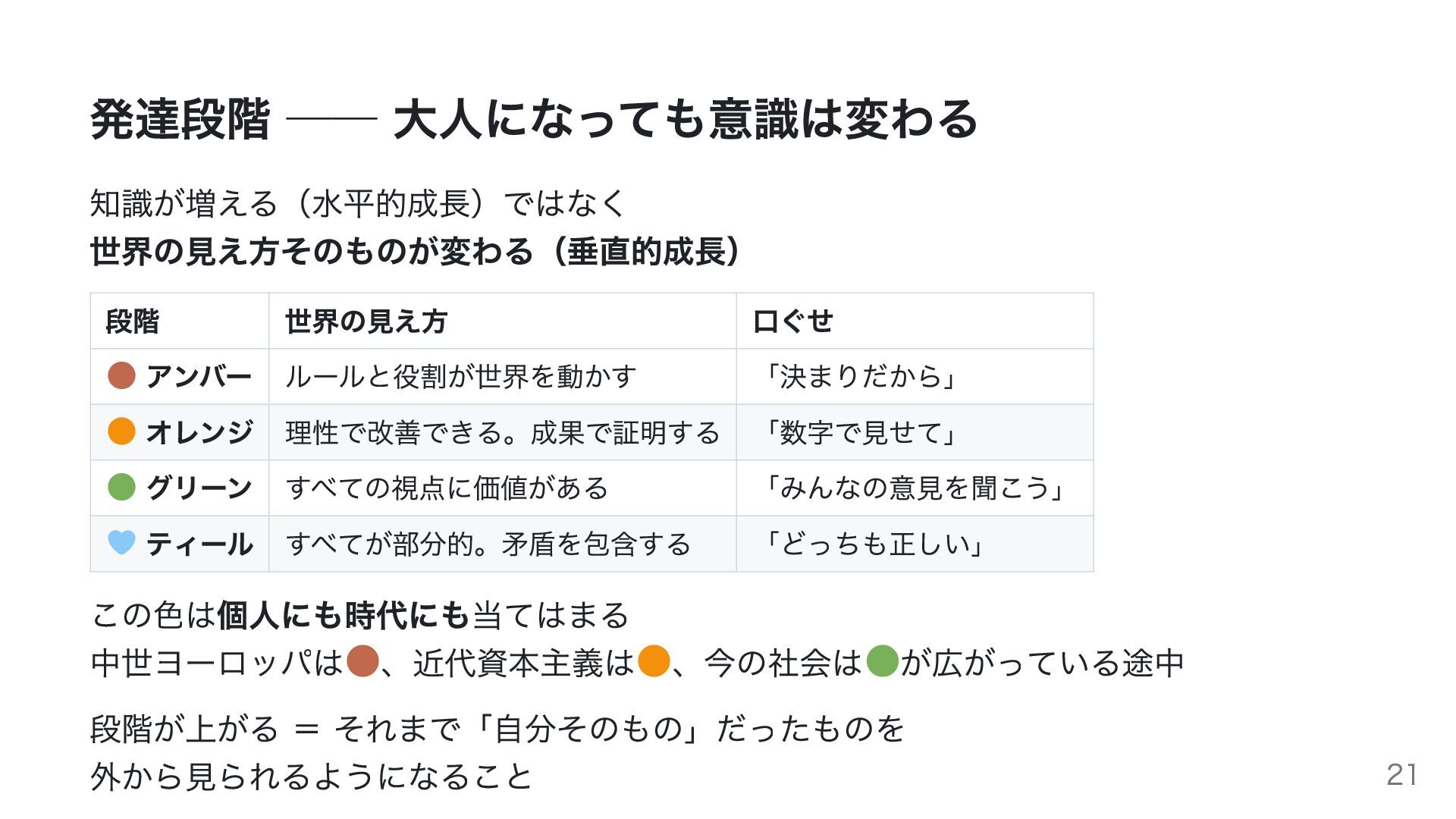 「決まりだから」 オレンジ 理性で改善できる。成果で証明する 「数字で見せて」 グリーン すべての視点に価値がある 「みんなの意見を聞こう」 ティール すべてが部分的。矛盾を包含する 「どっちも正しい」 この色は個人にも時代にも当てはまる 中世ヨーロッパは 、近代資本主義は 、今の社会は が広がっている途中 段階が上がる = それまで「自分そのもの」だったものを 外から見られるようになること 21