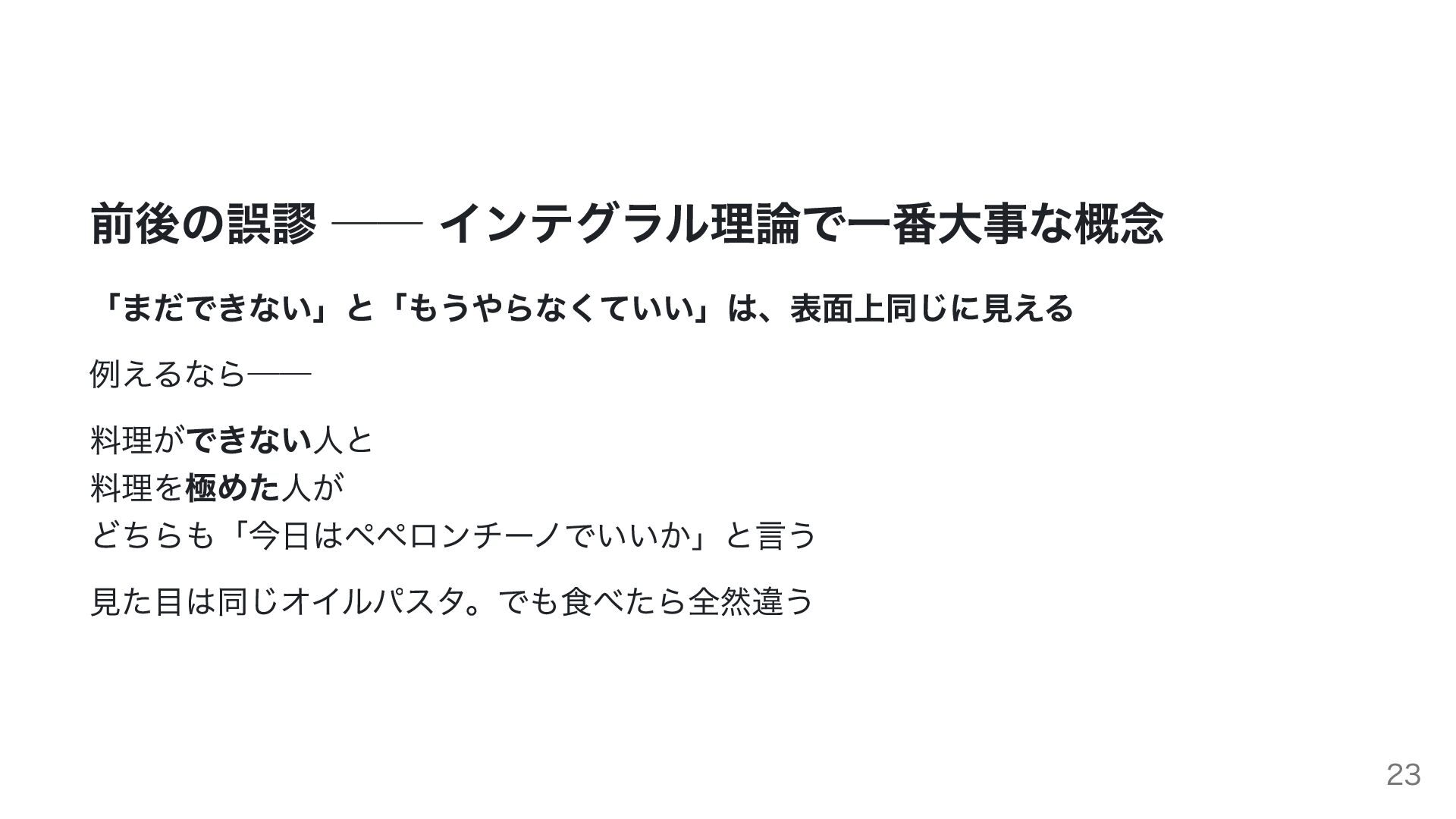 前後の誤謬 ── インテグラル理論で一番大事な概念 「まだできない」と「もうやらなくていい」は、表面上同じに見える 例えるなら── 料理ができない人と 料理を極めた人が どちらも「今日はペペロンチーノでいいか」と言う 見た目は同じオイルパスタ。でも食べたら全然違う 23