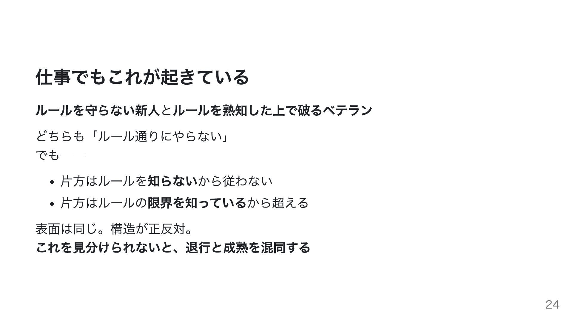 仕事でもこれが起きている ルールを守らない新人とルールを熟知した上で破るベテラン どちらも「ルール通りにやらない」 でも── 片方はルールを知らないから従わない 片方はルールの限界を知っているから超える 表面は同じ。構造が正反対。 これを見分けられないと、退行と成熟を混同する 24