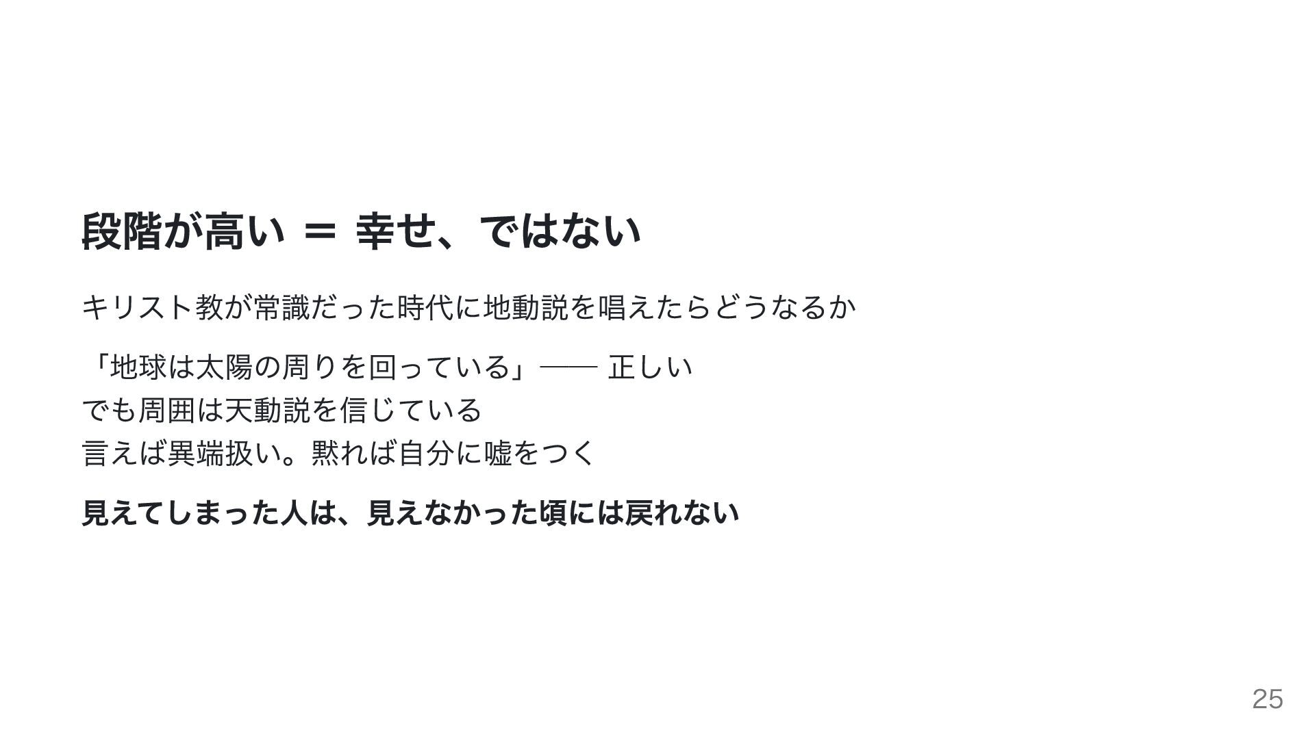 段階が高い = 幸せ、ではない キリスト教が常識だった時代に地動説を唱えたらどうなるか 「地球は太陽の周りを回っている」── 正しい でも周囲は天動説を信じている 言えば異端扱い。黙れば自分に嘘をつく 見えてしまった人は、見えなかった頃には戻れない 25