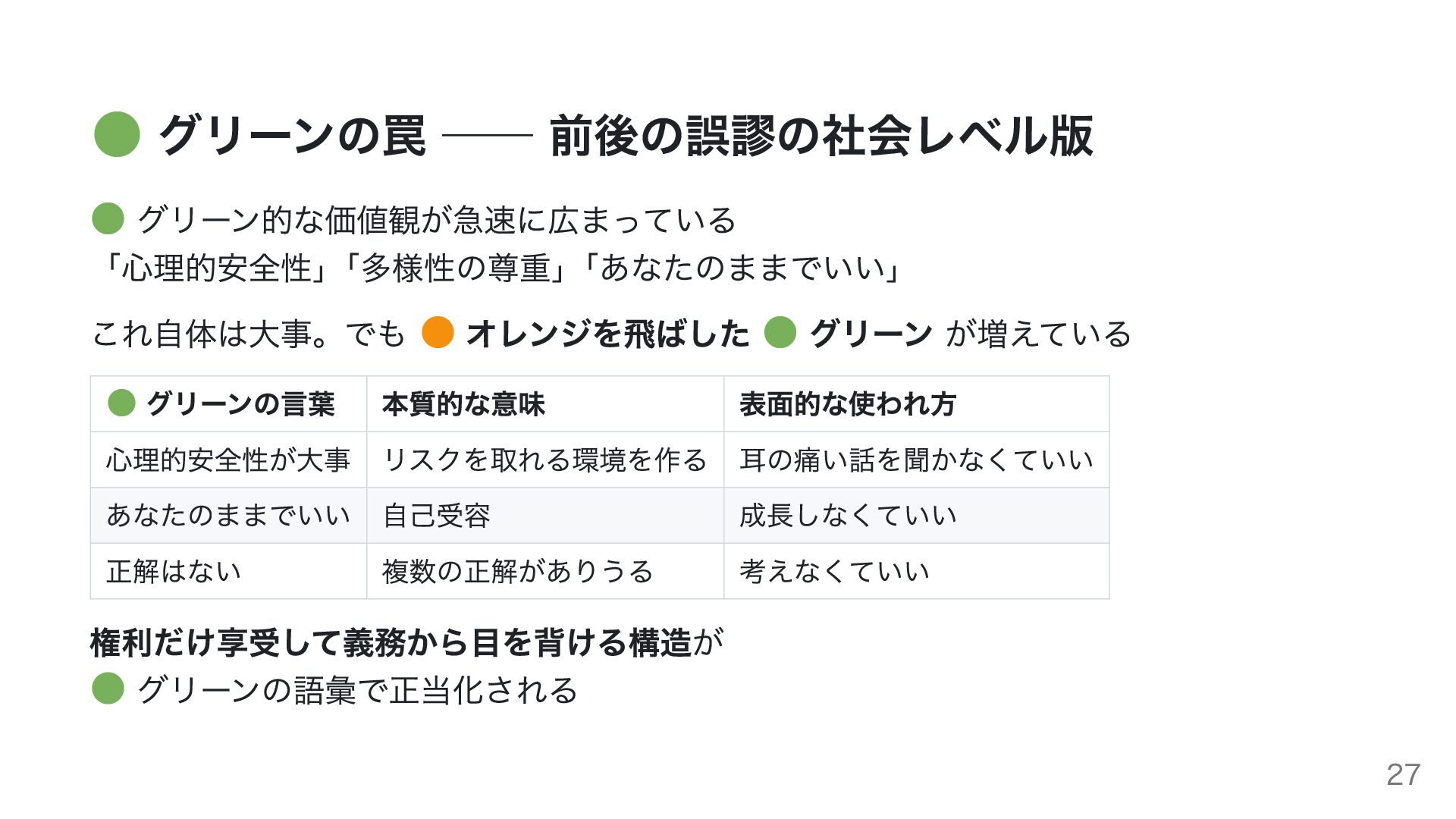 グリーンの罠 ── 前後の誤謬の社会レベル版 グリーン的な価値観が急速に広まっている 「心理的安全性」 「多様性の尊重」 「あなたのままでいい」 これ自体は大事。でも オレンジを飛ばした グリーン