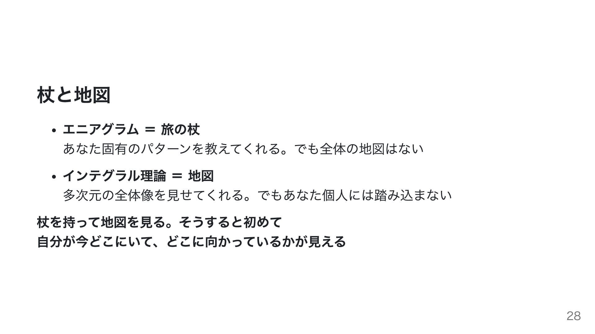 メタ認知のフレームワーク。多次元で自分の見方の偏りを知る 2つを組み合わせる理由 → 杖(エニアグラム)と地図(インテグラル)で初めて歩ける 29