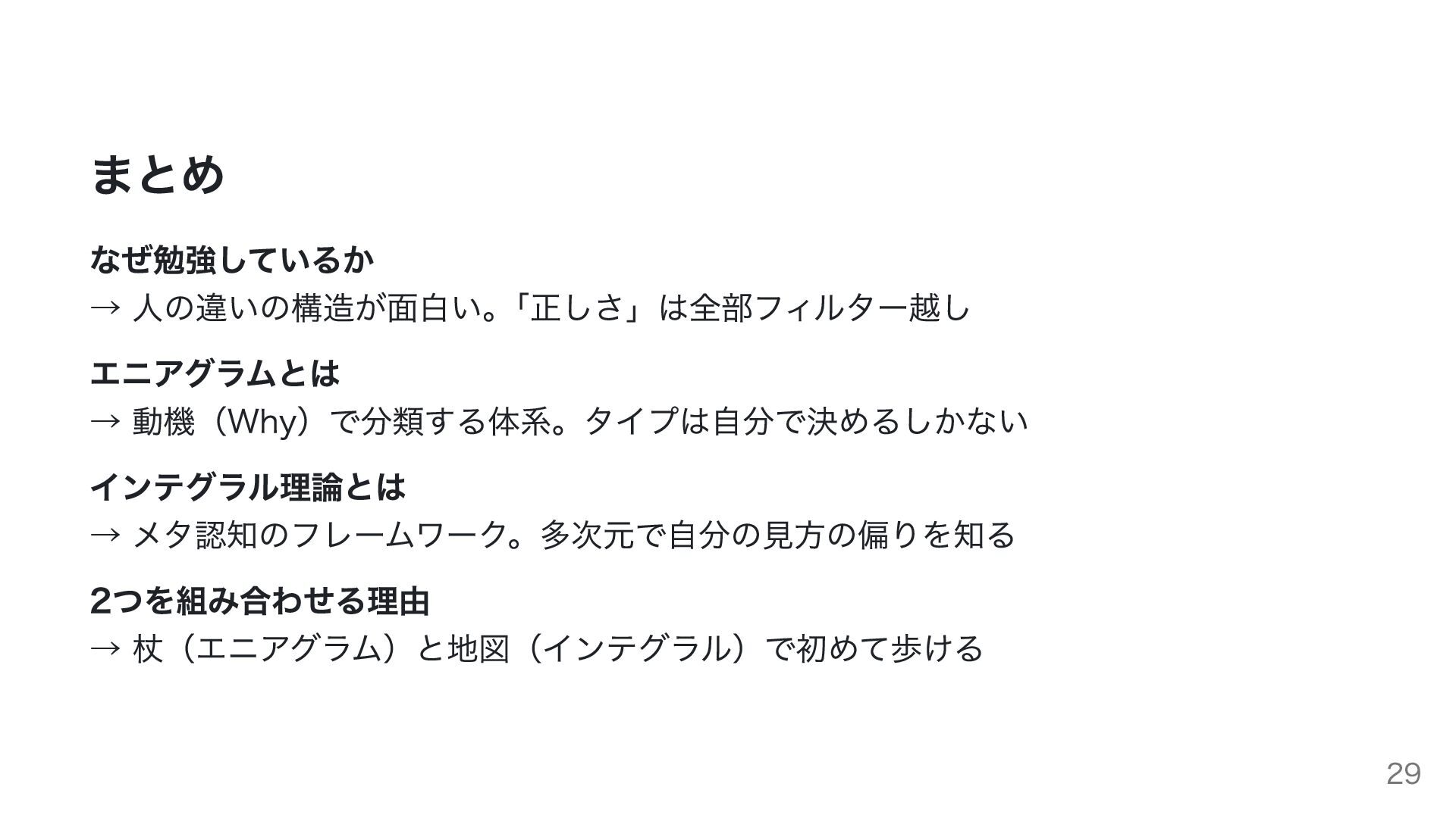 まとめ なぜ勉強しているか → 人の違いの構造が面白い。 「正しさ」は全部フィルター越し エニアグラムとは → 動機(Why)で分類する体系。タイプは自分で決めるしかない インテグラル理論とは →