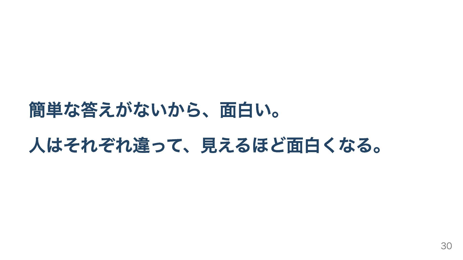 簡単な答えがないから、面白い。 人はそれぞれ違って、見えるほど面白くなる。 30