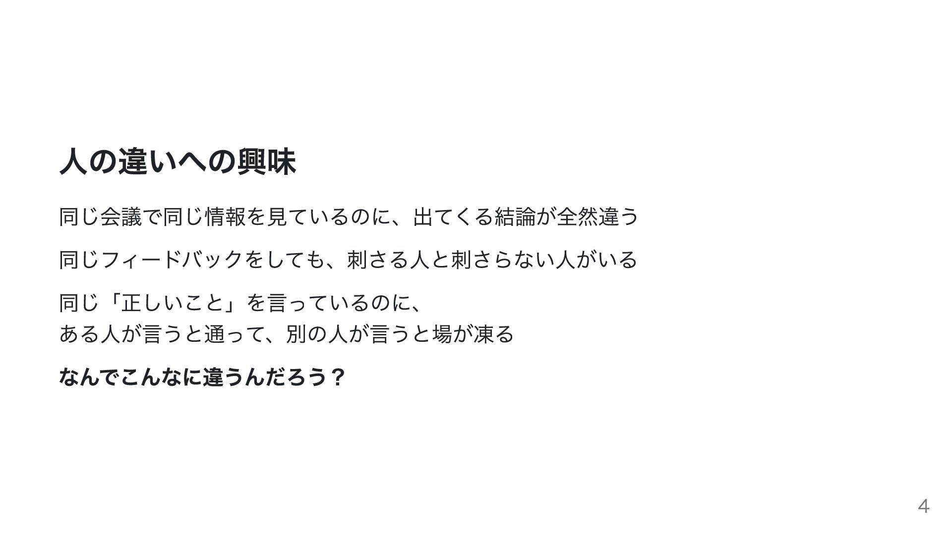 人の違いへの興味 同じ会議で同じ情報を見ているのに、出てくる結論が全然違う 同じフィードバックをしても、刺さる人と刺さらない人がいる 同じ「正しいこと」を言っているのに、 ある人が言うと通って、別の人が言うと場が凍る なんでこんなに違うんだろう? 4