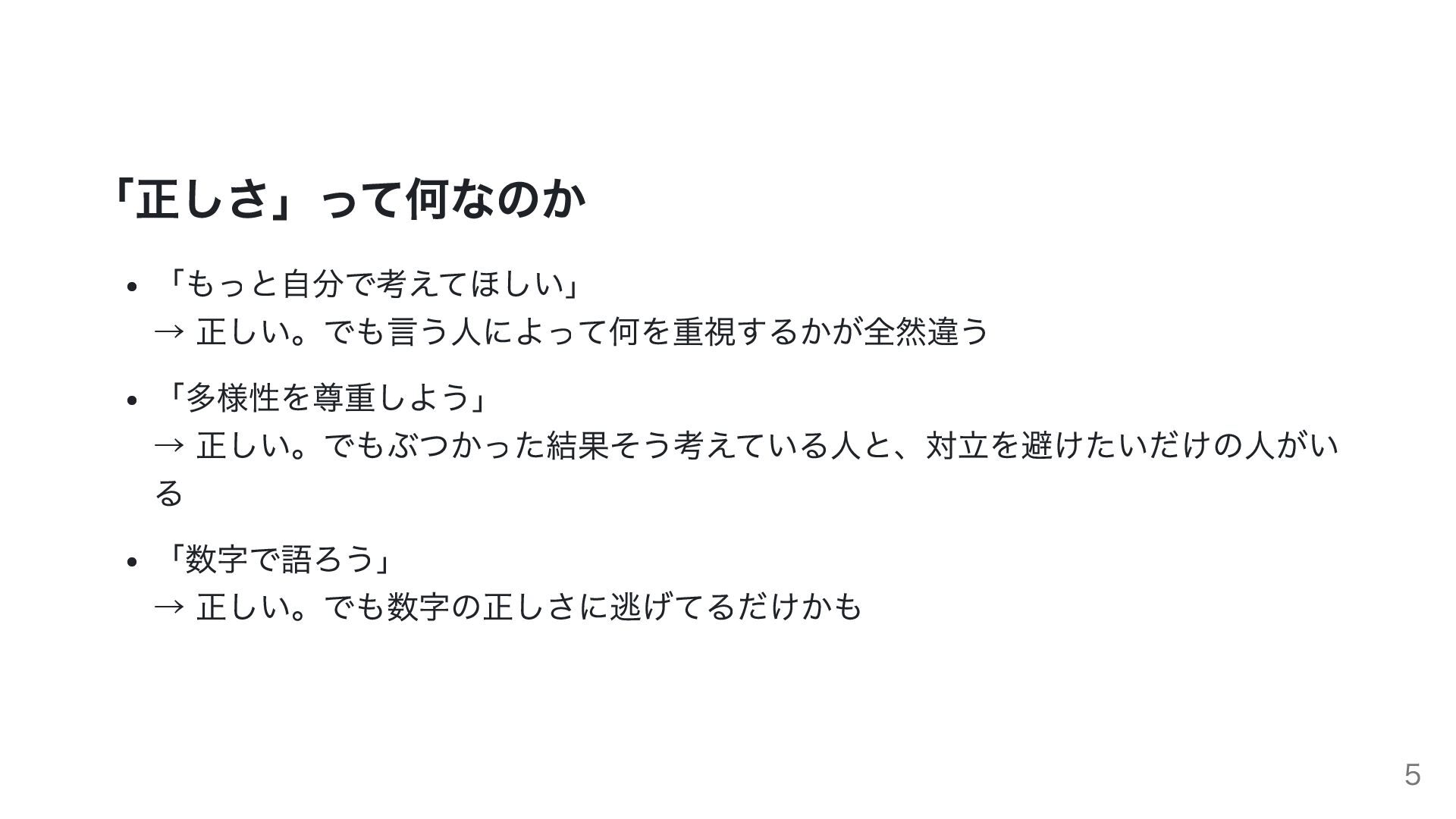 「正しさ」って何なのか 「もっと自分で考えてほしい」 → 正しい。でも言う人によって何を重視するかが全然違う 「多様性を尊重しよう」 → 正しい。でもぶつかった結果そう考えている人と、対立を避けたいだけの人がい る 「数字で語ろう」 →