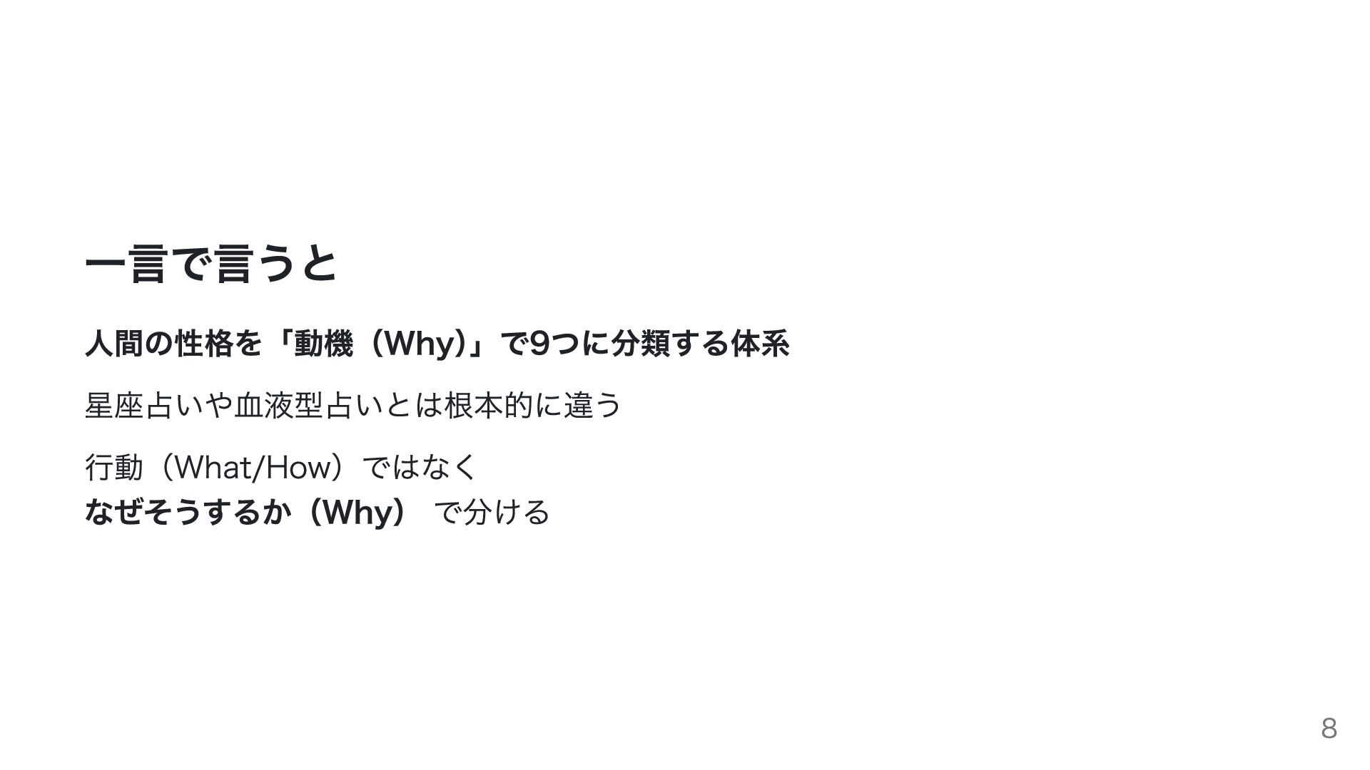 一言で言うと 人間の性格を「動機(Why) 」で9つに分類する体系 星座占いや血液型占いとは根本的に違う 行動(What/How)ではなく なぜそうするか(Why) で分ける 8