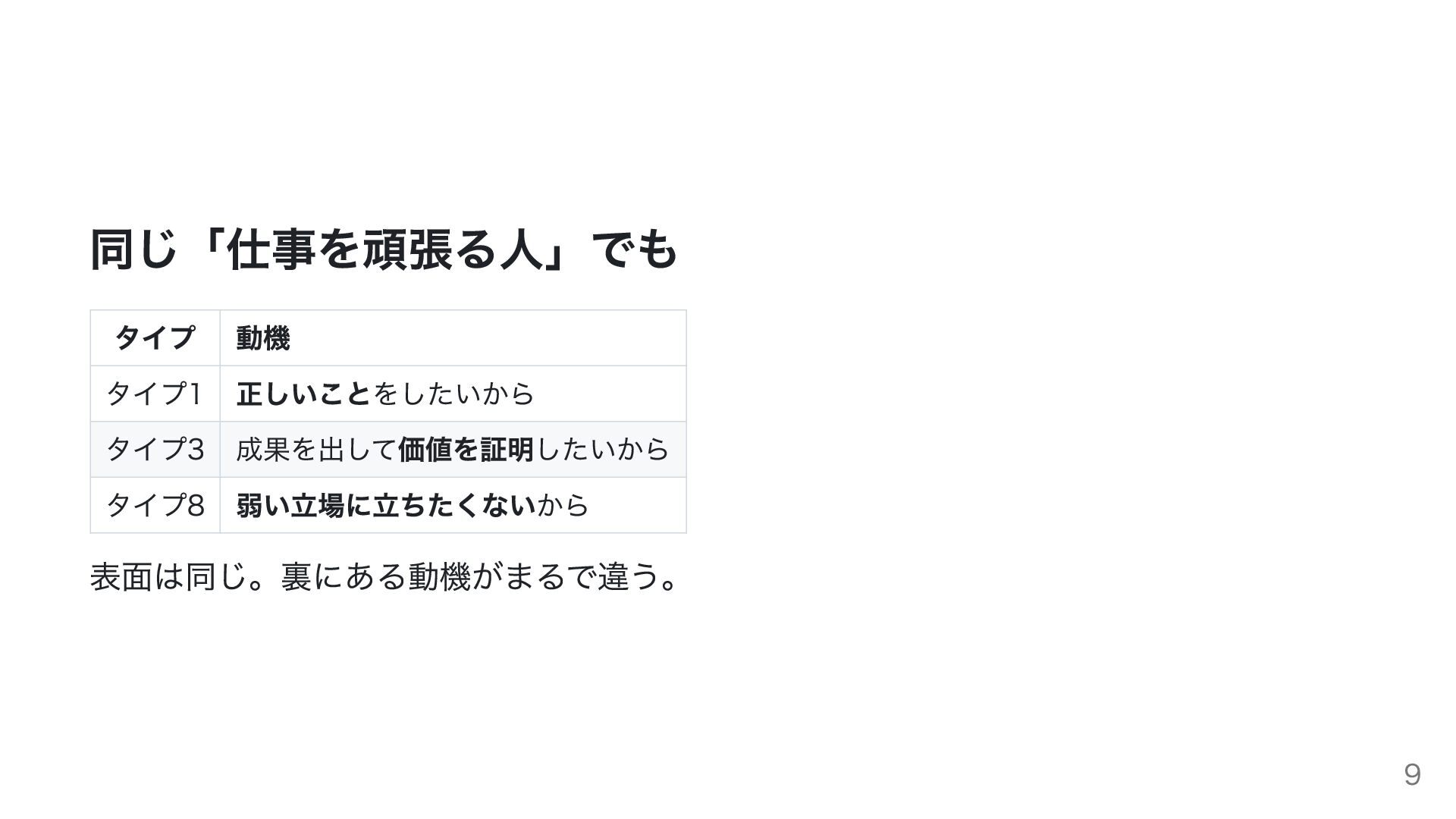 同じ「仕事を頑張る人」でも タイプ 動機 タイプ1 正しいことをしたいから タイプ3 成果を出して価値を証明したいから タイプ8 弱い立場に立ちたくないから 表面は同じ。裏にある動機がまるで違う。