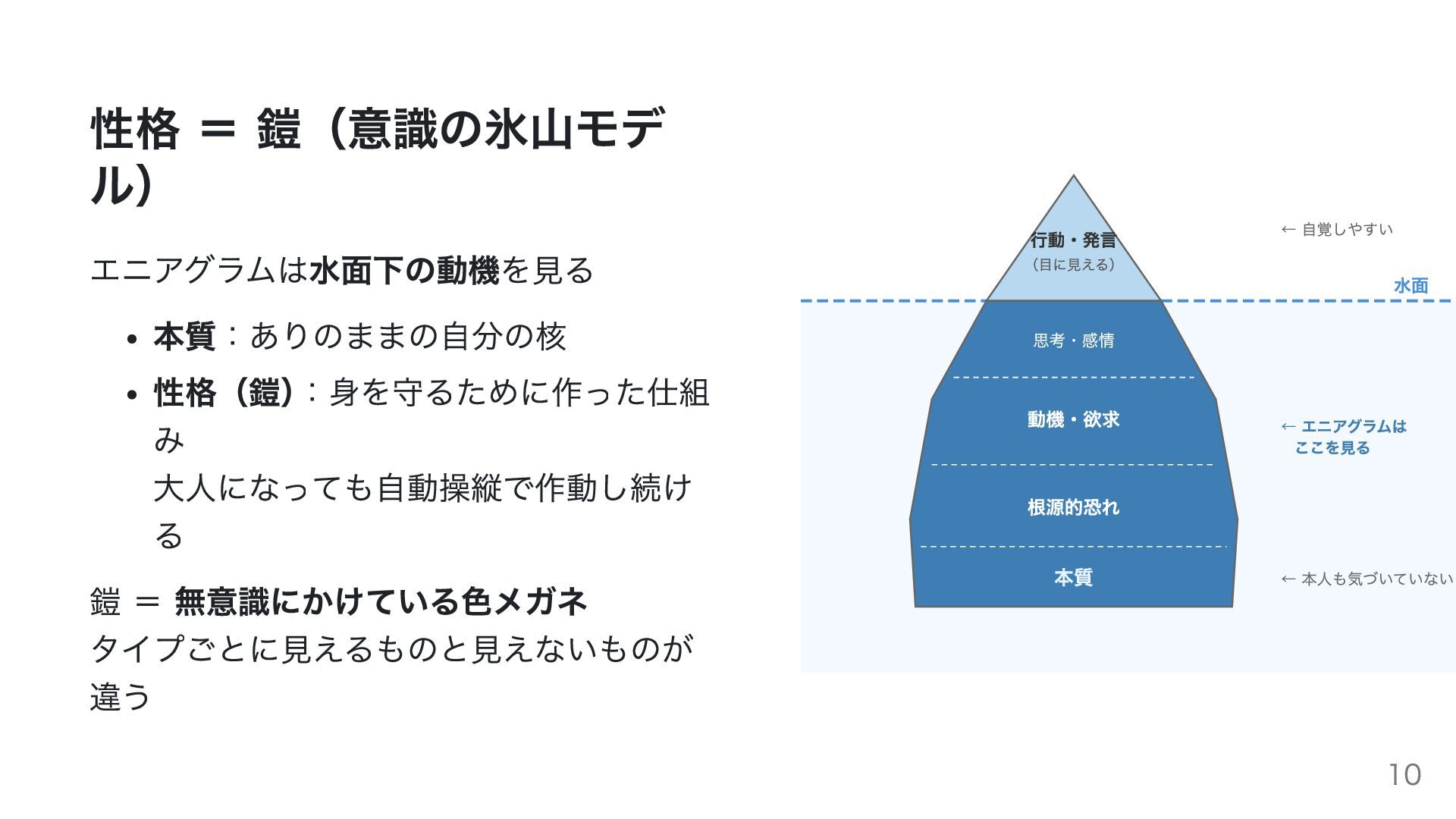 エニアグラムは ここを⾒る ← 本⼈も気づいていない 性格 = 鎧(意識の氷山モデ ル) エニアグラムは水面下の動機を見る 本質:ありのままの自分の核 性格(鎧) :身を守るために作った仕組 み 大人になっても自動操縦で作動し続け る 鎧 = 無意識にかけている色メガネ タイプごとに見えるものと見えないものが 違う 10
