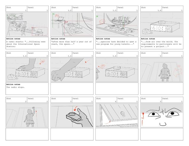 news about the International Space Station: Shot 1.2 Panel 1 Action notes "after more than half a year out of reach, the space..." Shot 1.3 Panel 1 Action notes "...agencies have decided to open a new program for young talents..." Shot 1.4 Panel 1 Action notes "...from all over the world. The requirements to participate will be to present a project..." Shot 1.4 Panel 2 Action notes The radio stops. Shot 1.4 Panel 3 Shot 1.4 Panel 4 Shot 2 Panel 1 Shot 2 Panel 2 Shot 3 Panel 1 Shot 4 Panel 1 Shot 5 Panel 1