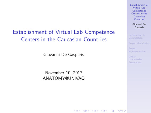 Giovanni De Gasperis Introduction to Gamification Project description Project implementation Virtual Laboratories Prototypes Establishment of Virtual Lab Competence Centers in the Caucasian Countries Giovanni De Gasperis November 10, 2017 ANATOMY@UNIVAQ