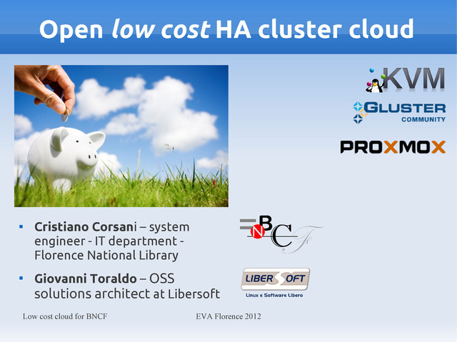 In the last few years, one of the main problems of the cultural heritage institution is the progressive reduction of the investments. The hardware maintenance and licensing costs greatly affects IT budget. Virtualization addresses the need to streamline and consolidate infrastructure, even if the license costs remain high for commercial clouds. Open source solutions allow you to implement virtualization cloud which performance and functionality are suitable for the masses, without the constraints of hardware certifications and proibitive licenses costs.
