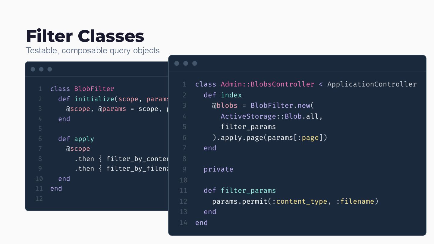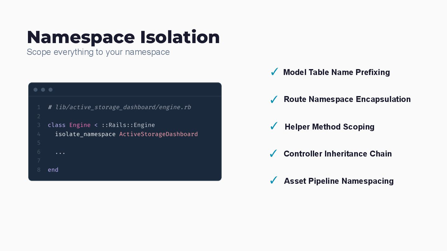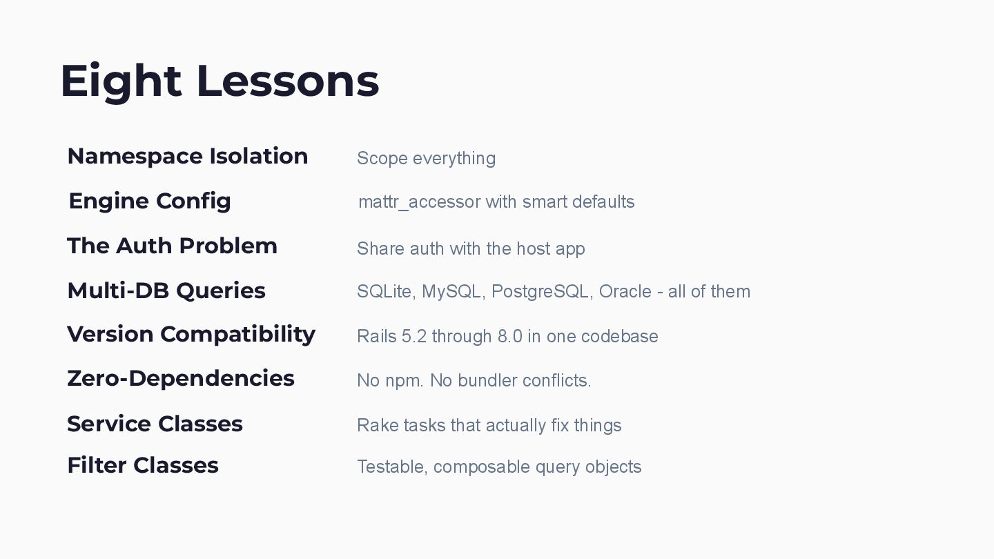 app Namespace Isolation Scope everything Multi-DB Queries SQLite, MySQL, PostgreSQL, Oracle - all of them Version Compatibility Rails 5.2 through 8.0 in one codebase Zero-Dependencies No npm. No bundler conflicts. Service Classes Rake tasks that actually fix things Filter Classes Testable, composable query objects Engine Config mattr_accessor with smart defaults