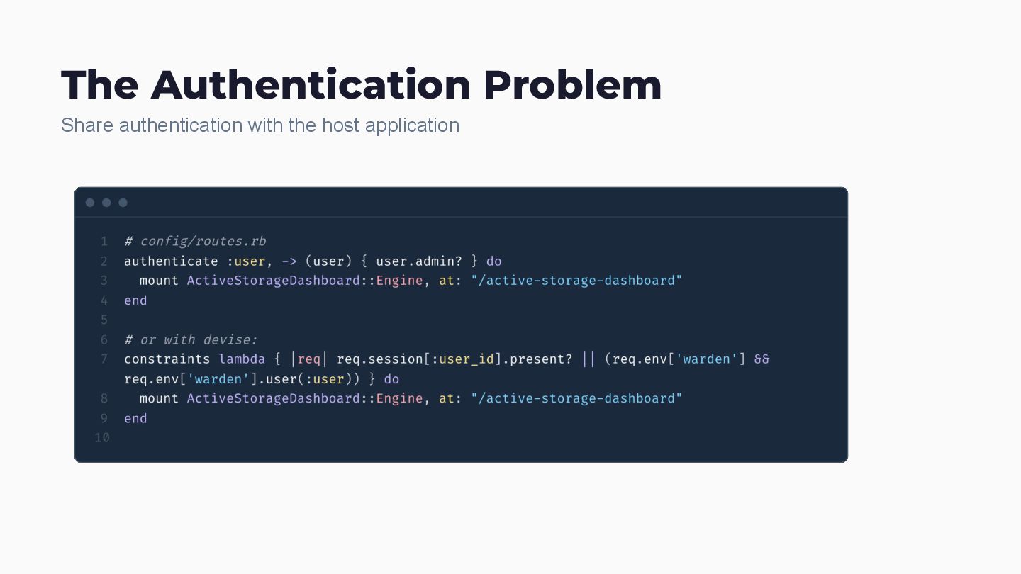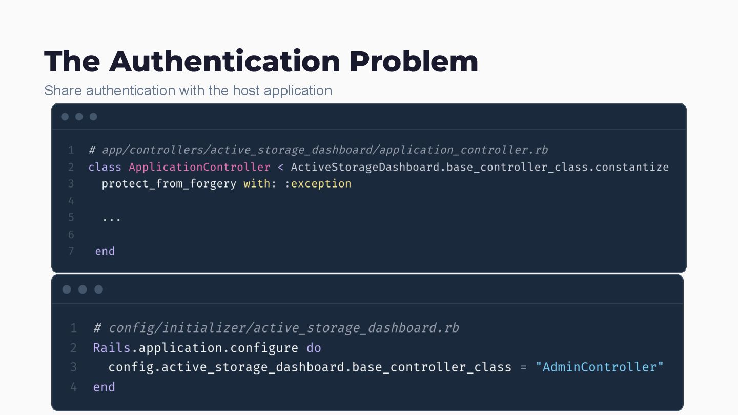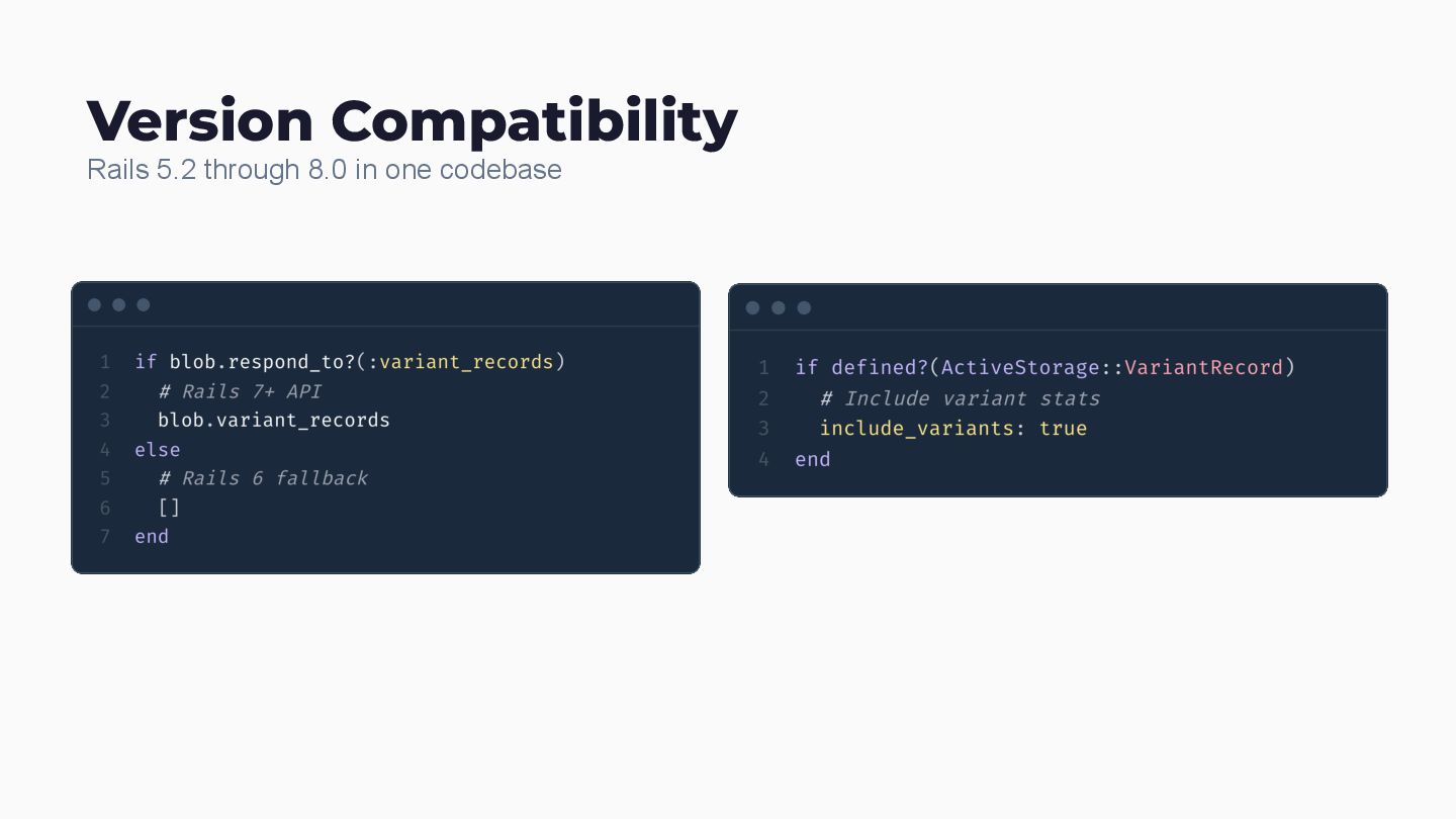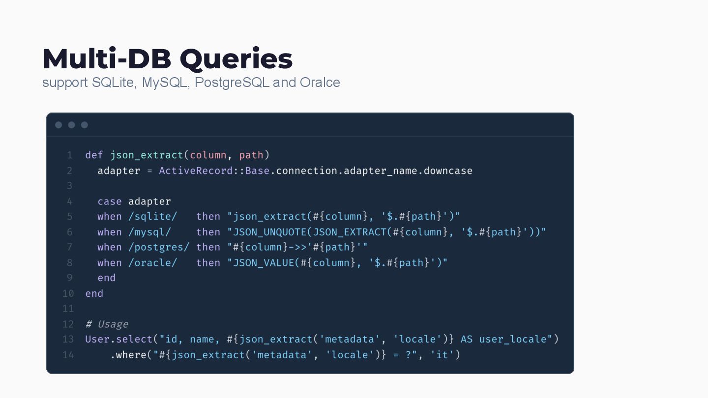 app Namespace Isolation Scope everything Multi-DB Queries SQLite, MySQL, PostgreSQL, Oracle - all of them Version Compatibility Rails 5.2 through 8.0 in one codebase Zero-Dependencies No npm. No bundler conflicts. Service Classes Rake tasks that actually fix things Filter Classes Testable, composable query objects Engine Config mattr_accessor with smart defaults