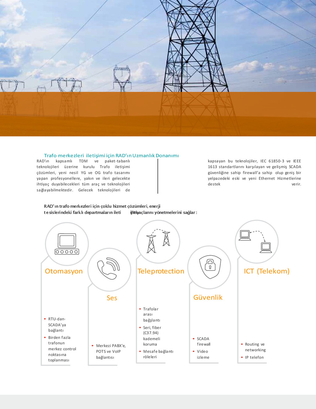 Dağıtım ve İletim Hizmetleri Sağlayıcıları 30 yılı aşkın bir süredir RAD, dünya çapında enerji hizmeti veren, kendi iletim ve dağıtım (T & D) şebekelerine, otomasyon, Teleprotection_ ve çekirdek operasyonel ağağlarına sahip firmaların ihtiyaçlarını karşılamak üzere, sahada kanıtlanmış iletişim çözümleri sağlamak için müşterileri ile yakın çalıştı. RAD fiber DSL ve PDH üzerinden desteklediği çoklu dağıtım modu senaryolarına sahip otomasyon, koruma, güvenlik, bilgi ve iletişim teknolojileri ağları için, güvenli, güvenilir, ölçeklenebilir, yönetilebilir ve performans garantili çözümler sunar. Hizmet sağlama, trafik yönetimi, zamanlama senkronizasyonu, TDM pseudowire, süregelen performans izleme, hata yönetimi, ve çeşitli dayanıklılık mekanizmaları dahil geniş bir dizi yeteneği içerir.