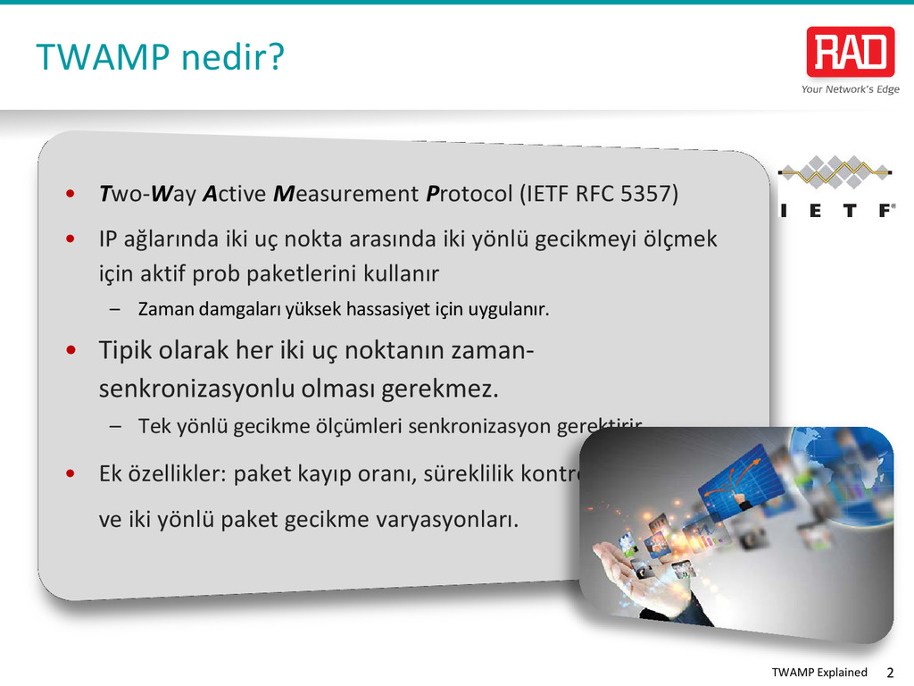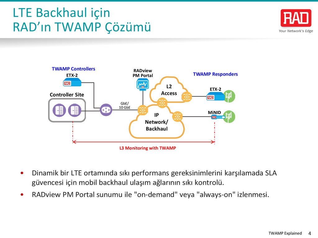 etkili bir standart temelli bir yöntemdir. • L3 içerisinde Performans garantileme artık yüksek seviyeli iş hizmetleri ve LTE backhaul'de beklenti haline geldi. • Bu nedenle TWAMP desteği, servis güvenceli NID'lerde PM araç kutusunda kritik bir unsurdur. • RAD Hizmet güvenceli erişim çözümü, tüm form-faktörlerinde hizmet sunumu ve performans izleme için tam L2 ve L3 desteği sağlar: TWAMP Kazanımları ETX-2 IP and Carrier Ethernet Demarcation MiNID Miniature Programmable NID RADview Performance Monitoring Portal V i s i t w w w . r a d . c o m f o r m o r e i n f o r m a t i o n